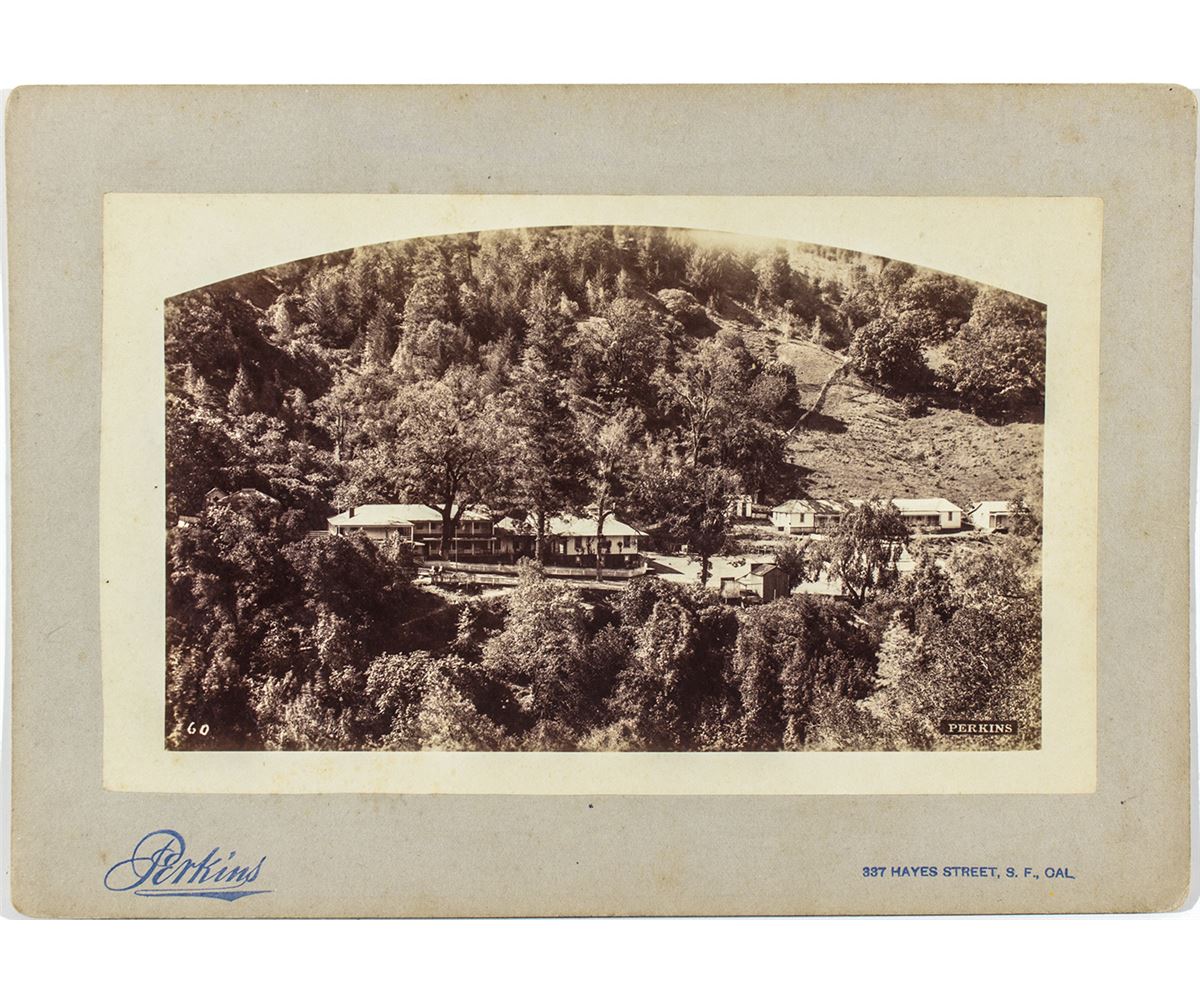 Photograph overlooking the Geyser Hotel. A hotel with several small cottages lay amongst a forested hillside. This resort began as early as 1852. On grey matte, focus is sharp and contrast is medium. In good condition with very little wear. Photographer unknown but was produced by the Perkins photo shop from San Francisco. 10’’x 7’’.