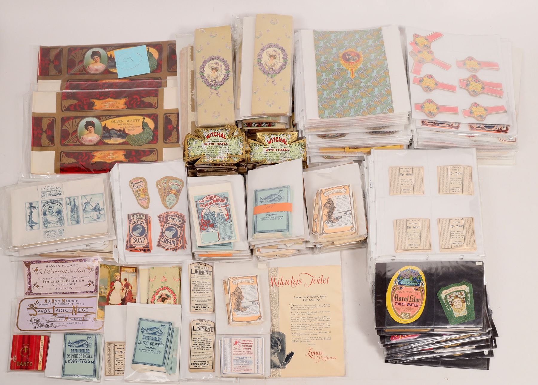 Several thousand, perhaps 3000++, mostly fancy and artistic French drug store labels. Tonics toilet water, soaps etc. A very large label lot, about 27 lbs.
