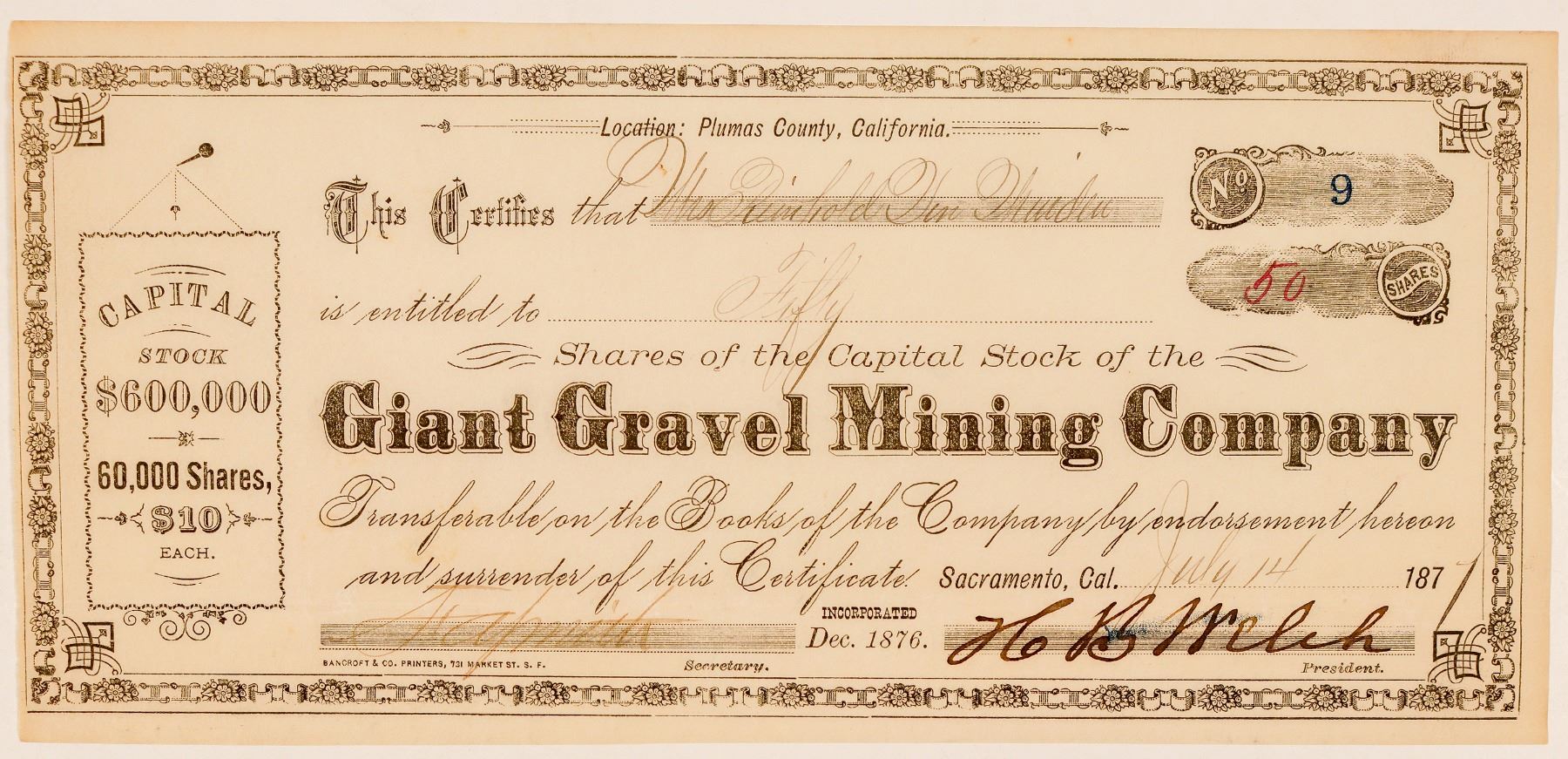 Location: Plumas County, California (printed at top center). Low number 9, issued in 1877 for 50 shares in Sacramento. Signed by president HB Welch and secretary Smith. Not cancelled. Simple design with black border and printing by Bancroft & Co., SF. Horizontal fold. Very fine condition. 4 x 8.75" Not in Filer or Holabird indexes. No additional info could be found. Ken Prag Collection