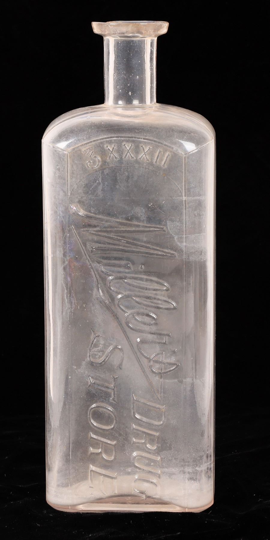 Giant 32 oz. clear embossed Miller's Drug Store bottle. Not listed in Fletcher, however was packed with Bracken's Oklahoma bottles. 10.25". .25" and .75" lip chips. Oklahoma Gary Bracken Collection