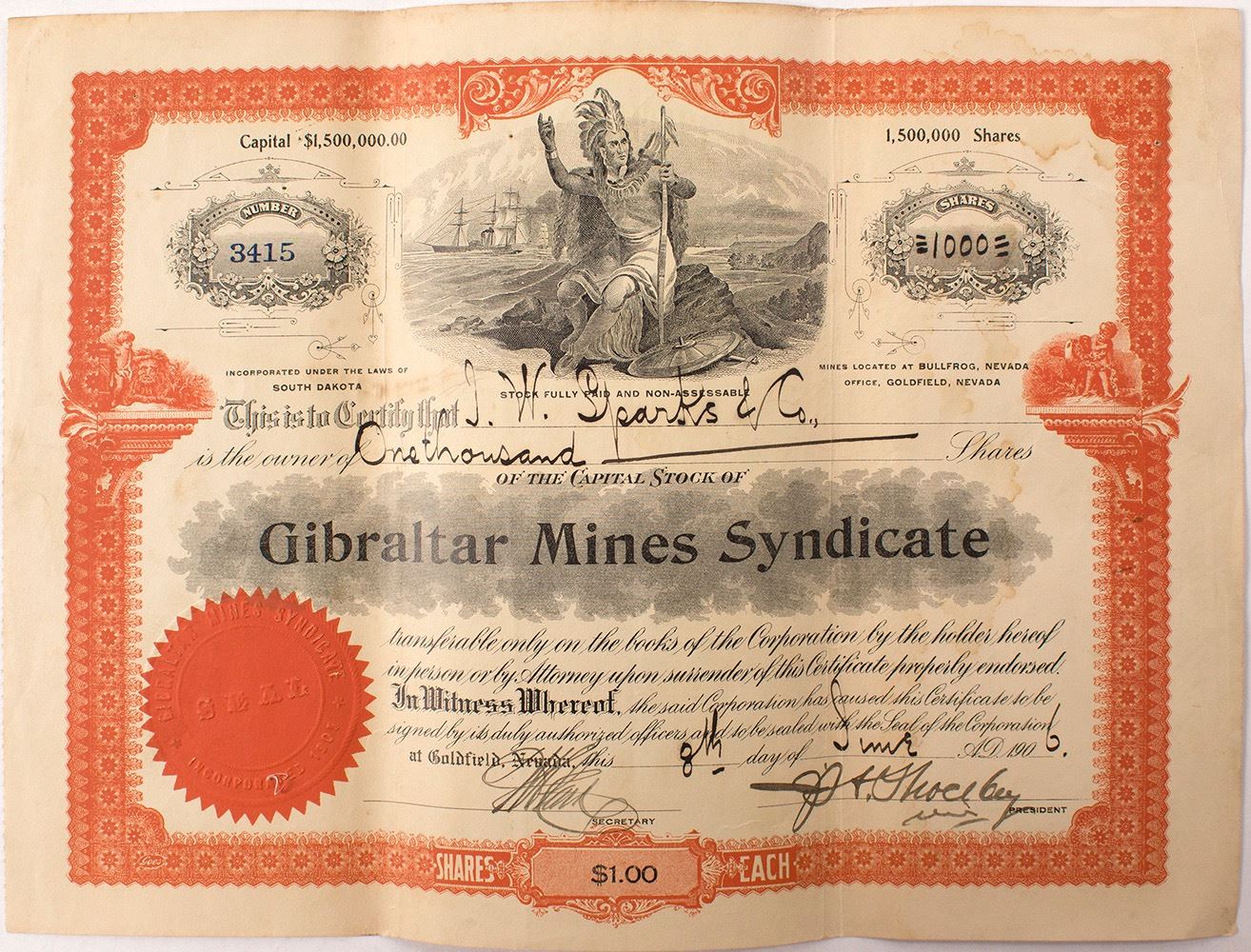 Certificate issued to Nevada Gov. John W. Sparks and Company, June 1906. Endorsed by the Sparks Company on the reverse. This is another example of Nevada Gov. Sparks active involvement in the Tonopah, Goldfield and Bullfrog region while he was sitting as governor. Date: 1906 Location: Bullfrog, Nevada HWAC# 56334