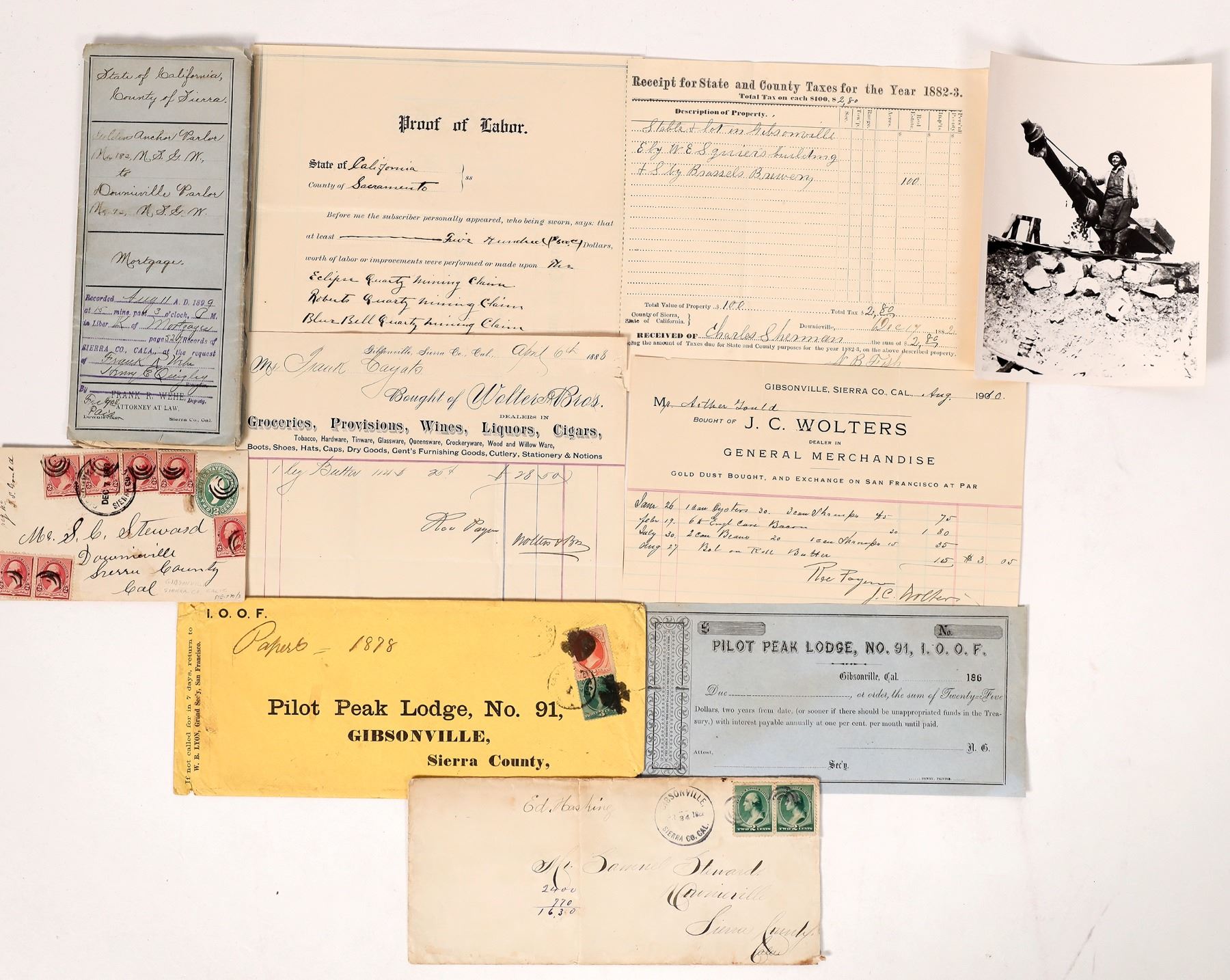 This is a unique and very nice collection from Gibsonville, California. Lot includes the following: 1x Mortgage document between the Native Sons of the Golden West (NSGW), Golden Anchor Parlor No. 182 of Gibsonville, Sierra County and NSGW Downieville Parlor No. 98, dated August 7, 1899, to pay $270 with 11% p.a. interest; 2x general store itemizations of sale, both datelined Gibsonville, California, the first from Wolters Bros. dated April 6, 1888, and the second from J.C. Wolters, dated August 1910 (no day); 1x Pilot Peak Lodge No. 91, I.O.O.F., unissued; 1x yellow I.O.O.F. envelope from Pilot Peak odge, No. 91, Gibsonville, Sierra County; 1x small envelope (5.5x3.25"), addressed to Mr. S.L. Steward, Downieville, Sierra County, Cal. annotated Gibsonville. The envelope came with a US postal stamp, 2-cent, green, but there are an additional 7x 2-cent red postal stamps attached, all cancelled; 1x envelope (8.75x4") addressed to Mr. Samuel Steward, Downieville, Sierra County, Cala., has two, green, US postal stamps attached, both cancelled, postmarked Gibsonville, Sierra County, Cal., April 24, 1888(?); 1x Receipt for State and County Taxes for the Year 1882-3, dated December 17, 1882, received from Charles Sherman for 3 properties (stable & lot in Gibsonville, Ely WES (illegible) building, +8 by Brassels Brewery. Total property value $100. Signed by A.B. Fish, Shweriff and Ex-Officio Tax Collector for Sierra Co., Cal.; Proof of Labor Certificate for the Eclipse Quartz Mining Claim, Roberts Quartz Mining Claim, and Blue Bell Quartz Mining Claim, certificate states $500 in improvements have been made to the claims, dated December 16, 1909; 1x c.1936 photograph of Don Merian standing next to mining monitor in Gibsonville. Gibsonville was named after (maybe) James L. Gibson. Gibson followed another group, led by Captain Sears, into the hills when Captain Sears was resupplying in Sacramento to go back to his secret area. At one point, Captain Sears refused to go any further. Eventually, an agreement was made between the two groups when Gibson agreed to pay $100 to each man in Captain Sears group. When they reached the high country, Sears staked claims and named them Secret Diggings, while Gibson and his men went off to an adjacent ridge near Onion Valley, where they found rich gold deposits. Gibson named the claim Secret Ravine and tried to keep the location secret. But it did not last and the area became the large and thriving town of Gibsonville (Garvis 2004).