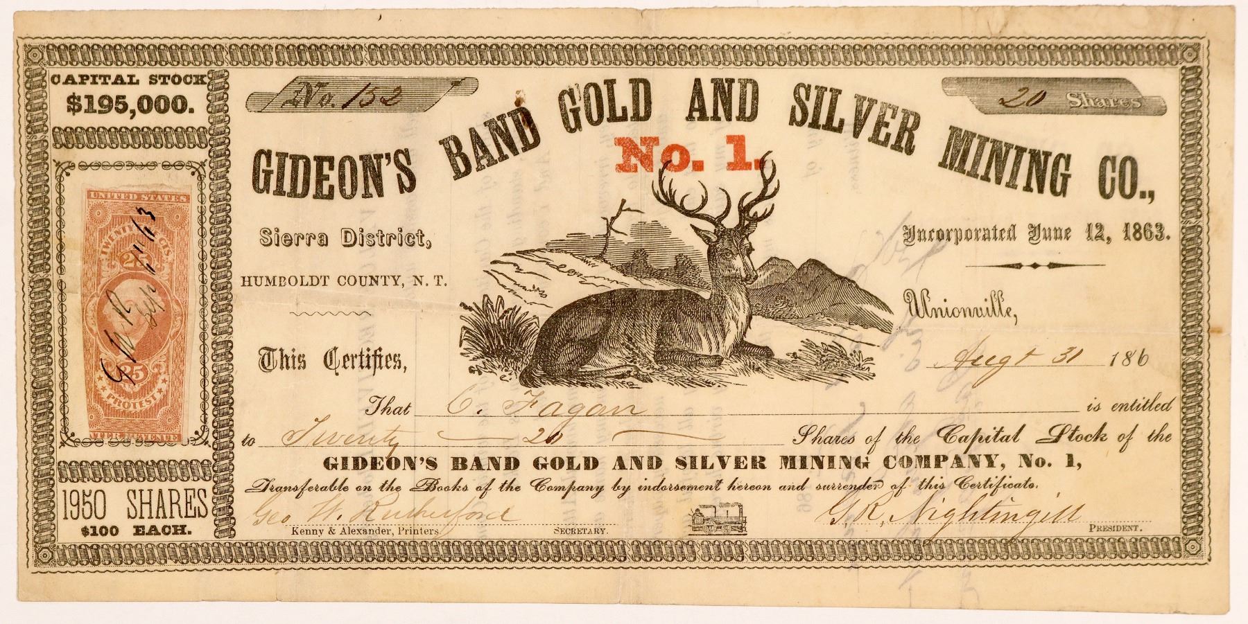 Dateline Unionville! Sierra District, Humboldt County, N.T. (printed to the left of the vignette). Inc. June 12, 1863. No. 152, issued for 20 shares to C. Fagan on August 31st, 1863 (date on stamp). Signed by president G.R. Nightingill and secretary Geo. Rusherford. Not cancelled. Black border and print. Vignette of deer with antlers. Tiny vignette of train. Printed by Kenny & Alexander. 25 cent US IR adhesive stamp attached on the left. Deep folds, creases, some soiling. 4.5 x 9.25" The Sierra District was organized in 1863 after the discovery of the gold-bearing Croesus ledge. No mentions found on CDNC. Listings found for No. 2 company, whose stock features a bear. Ken Prag Collection