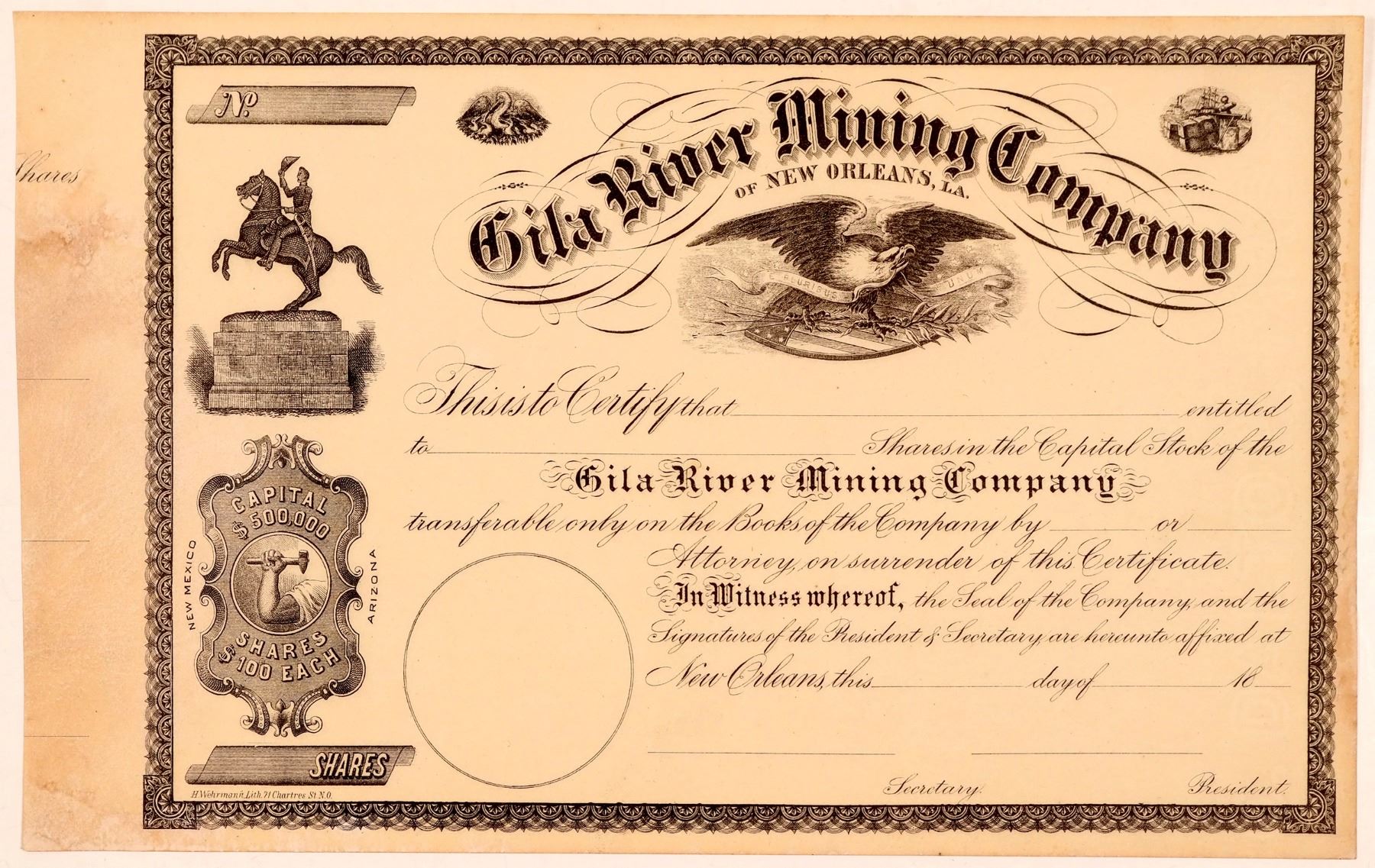 Inc. in New Orleans, Louisiana, circa 1859. U/U. "New Mexico and Arizona" at left. Eagle vignette top. Printed by H. Whermann, New Orleans. Datelined New Orleans 18__. This company probably worked the placer deposits along the Gila River around Gila City about 1859-60, went dormant with the onset of the Civil War, and reorganized in 1881 with new properties.