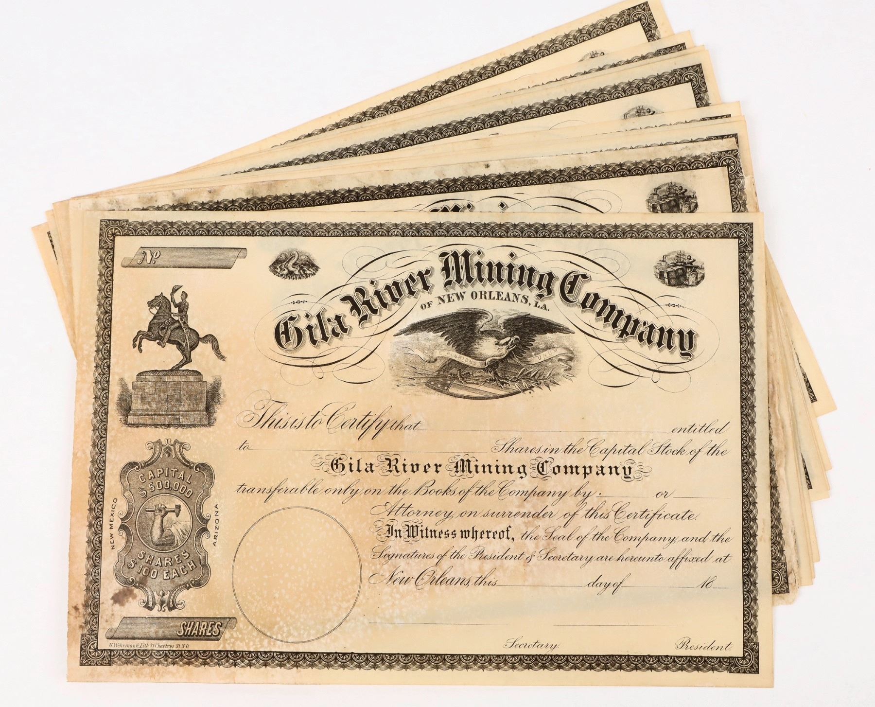 Inc. in New Orleans, Louisiana, circa 1859. Nine unissued. "New Mexico and Arizona" at left. Printed by H. Whermann, New Orleans. Datelined New Orleans. This company probably worked the placer deposits along the Gila River around Gila City about 1859-60, went dormant with the onset of the Civil War, and reorganized in 1881 with new properties.