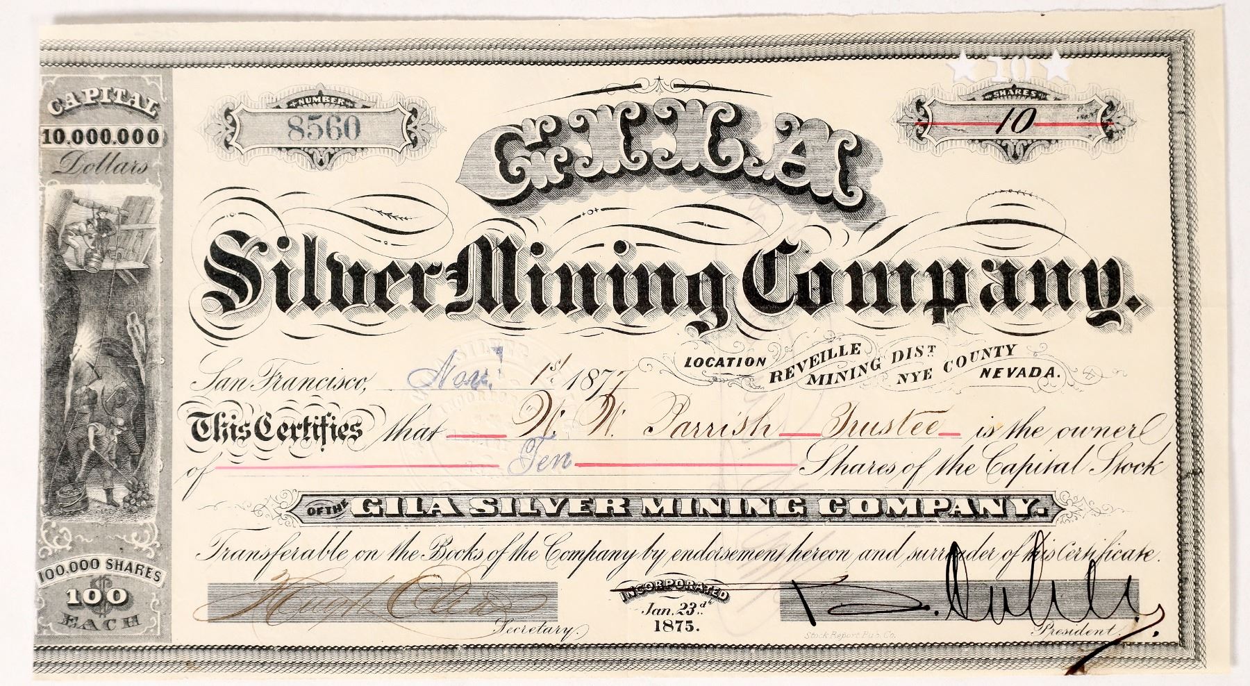 Gila Silver Mining Company stock certificate No. 8560, incorporated January 23, 1875 in California. Issued to W.W. Parrish for 10 shares ($100 per share) in San Francisco on November 1, 1877. Location: Reveille Mining District, Nye County, Nevada (printed under title). Signed by the president (illegible) and Hugh Elias (secretary). Uncanceled. Black border and print. Vignette of mine hoist (left). 5x9.25". Pinholes, folds. Left border trimmed tight.