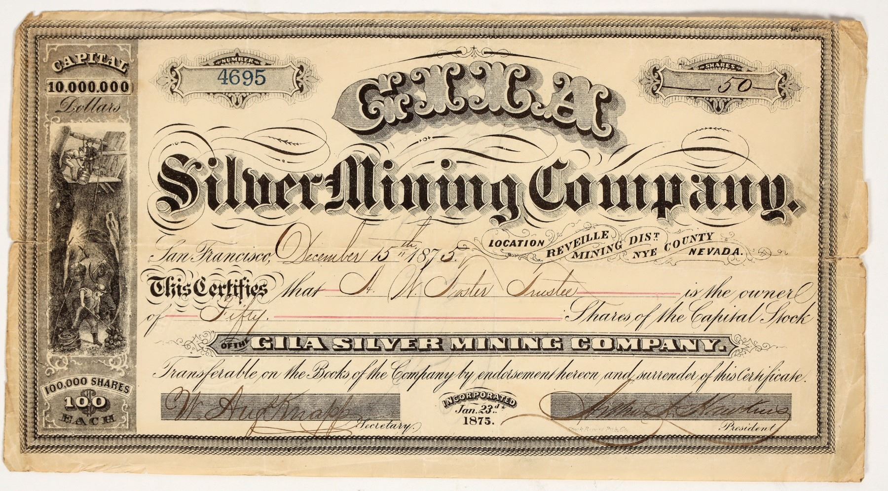 Rare location. Location: Reveille Mining District, Nye County, Nevada. Inc. 1875. No. 4695, issued for 50 shares to AW Foster in 1875. Signed by the president (illegible) and secretary. Not cancelled. Black border and print, underground mining vignette. No printer listed. Deep folds with some tears, creases, discoloration. The Reveille district is 35 miles from Tybo. In Thompson and West's 1881 "History of Nevada", the Gila is mentioned as the major mine in the Reveille District. It had a shaft of 460' and a tunnel 1000' long. The Gila was the major producer of this district. It ran from 1874 to 1891 and produced $530,000 of the $611,000 produced by the district. "The claim of this company, located above, embracing several locations, aggregating 100,000 feet, has been but partially prospected, but that little brought to light large bodies of milling ore, which return average assays of $100. Assays have been made high as $600. The mine is in a prosperous condition and work is pushed rapidly." (Annual Mining Review and Stock Ledger, 1876, p. 48).