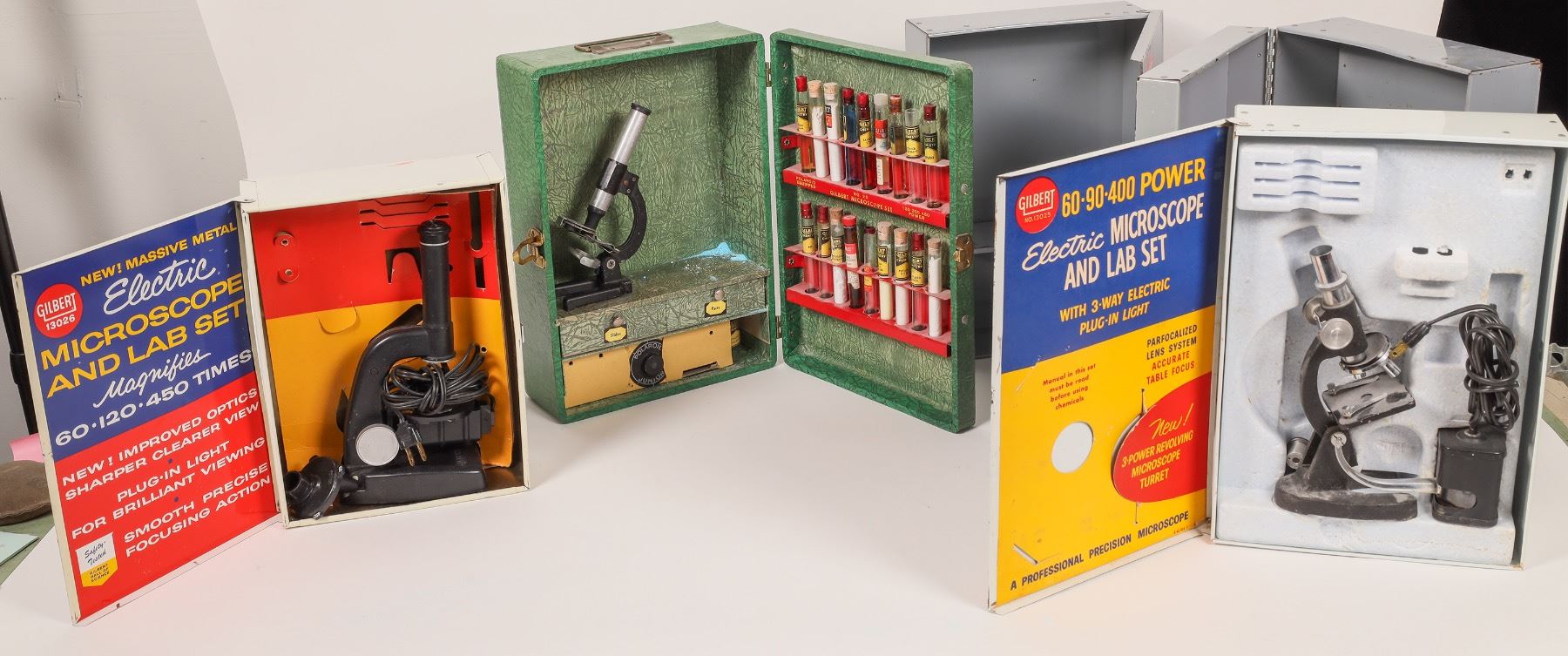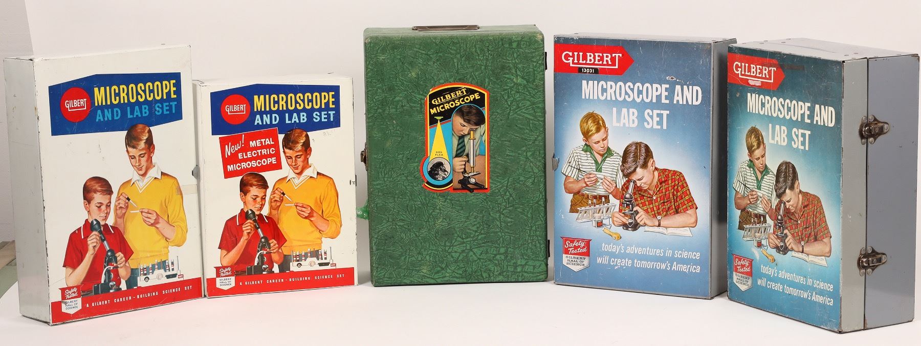 Empty metal Gilbert Microscope cases-2x blue microscope and lab set. Green paper box with some contents but no scope. 13026 set with broken clasp and 13025 set. Please inspect. About 17 lbs.