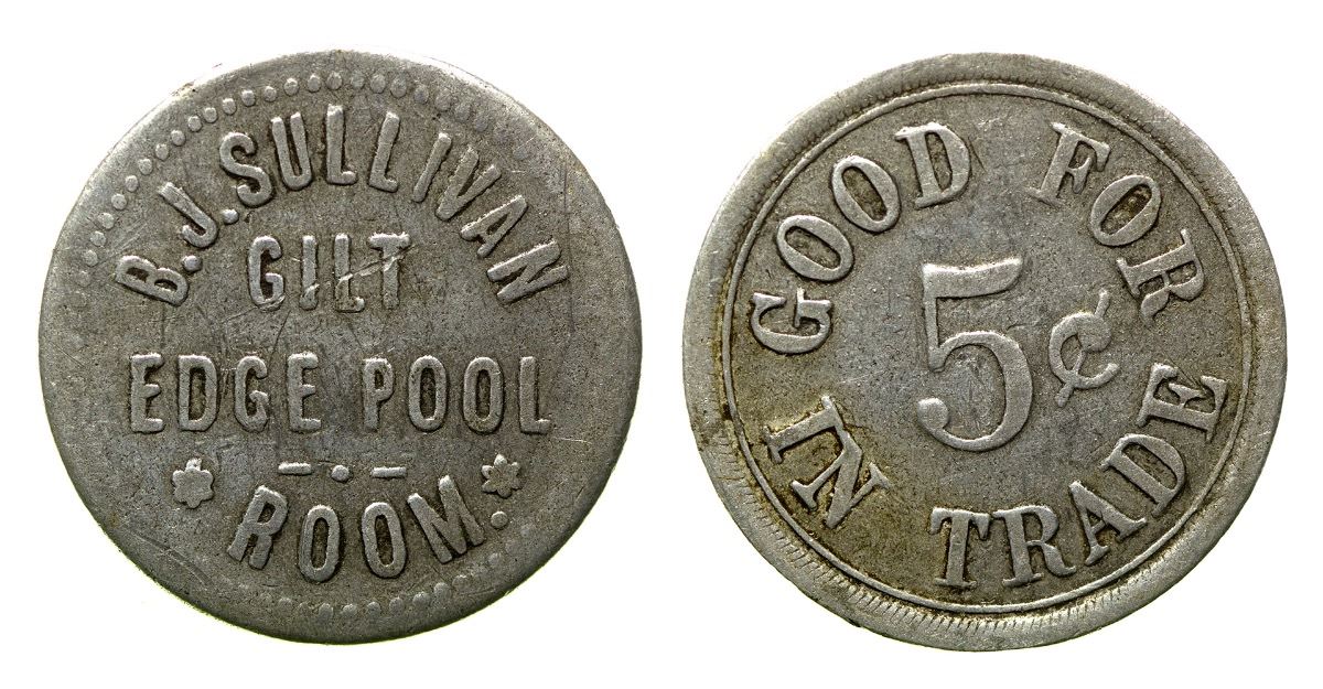 B. J. Sullivan / Gilt / Edge Pool / Room // GF / GF / 5c / IT. Round, aluminum, 29mm. Giltedge is named after the whiskey. (Svoboda Collection) City: Giltedge State: Montana Date: HWAC# 35825
