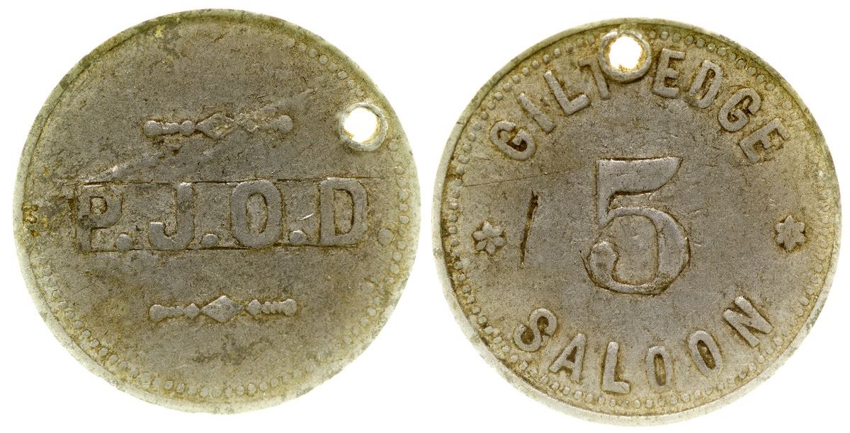 Gilt Edge was a San Francisco whiskey manufacturer from 1882-1915 with 8 different trademarked embossed bottles. See Barnett pg. 163. Gilt Edge / 5 /Saloon // P.J.O.D. Round, Aluminum, Punched, 24mm. City: San Francisco State: California Inventory Number: 38940