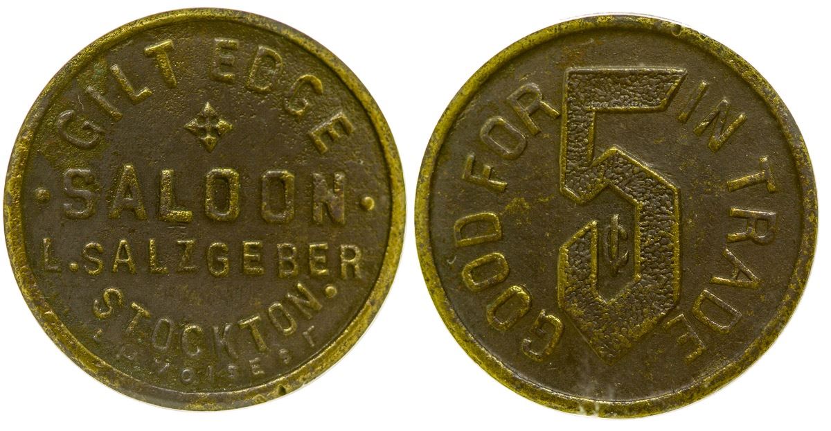 Gilt Edge Saloon whiskey token from Stockton CA. Gilt Edge was a major trademarked whiskey distiller with 8 different embossed whiskey bottles. see Barnett 162. Gilt Edge / Saloon / L. Salzgeber / Stockton / L H Moisesi // GF / 5c/ In Trade. Round, Brass, 21mm. City: Stockton State: California Inventory Number: 38937