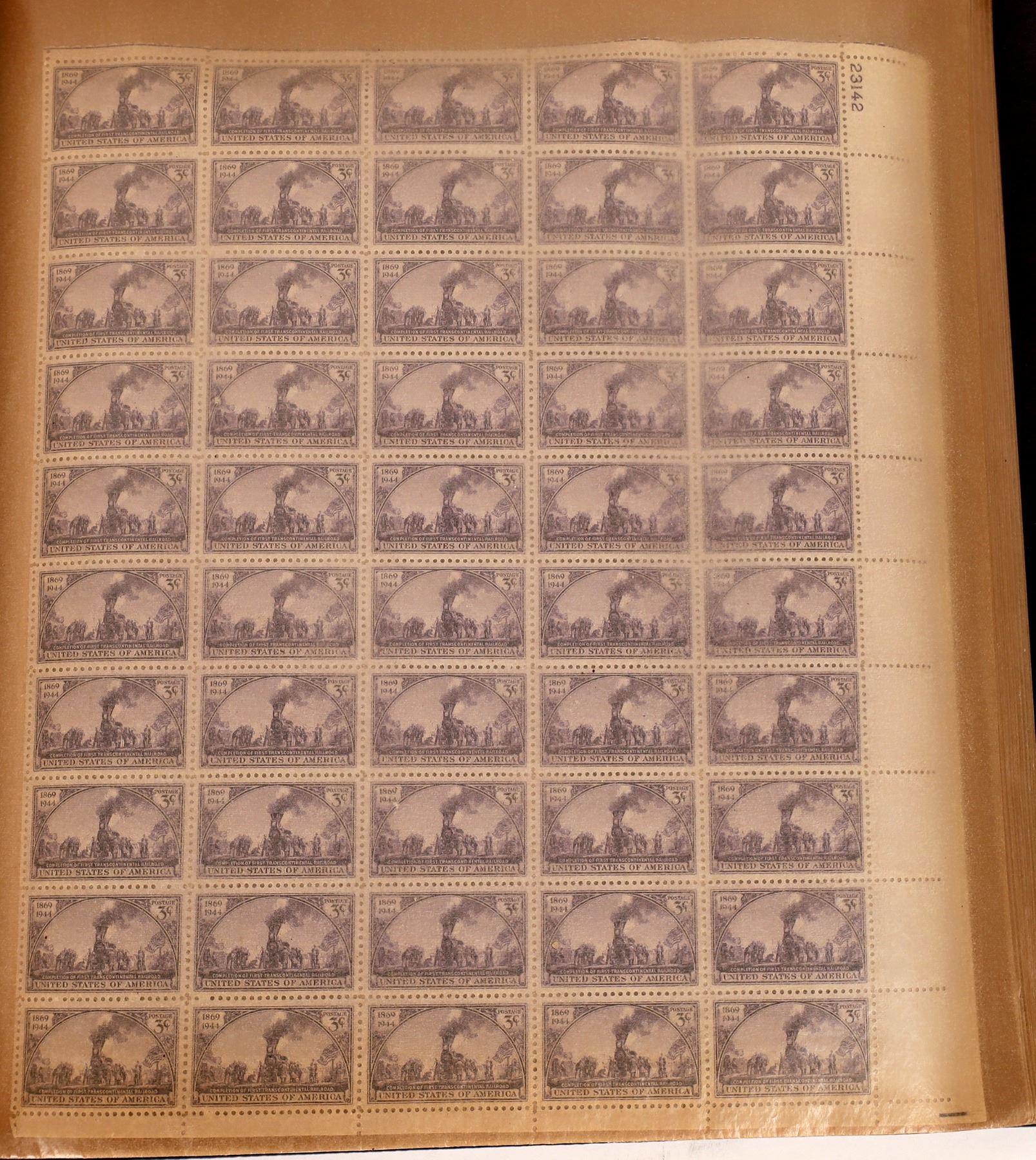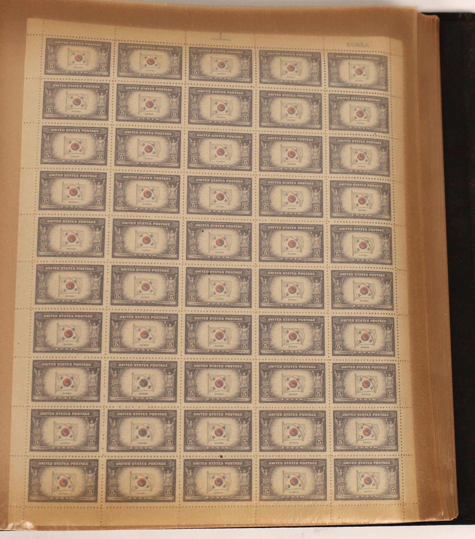 A Gimbels Mint Sheet Album with 100+ United States Mint postage sheets. On inner front cover of album is a 1-3/4 x 1-1/2 inch sticker reading, "Property of Stephen M. Klee 167." The album is black with green striped accents and text on the front reading "Gimbels Mint Sheet Album." There is minor scuffing to corners and aged sellotape on the inner cover. Album dimensions are 11-7/8 x 12 inches.