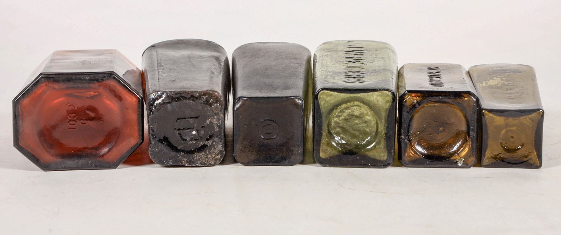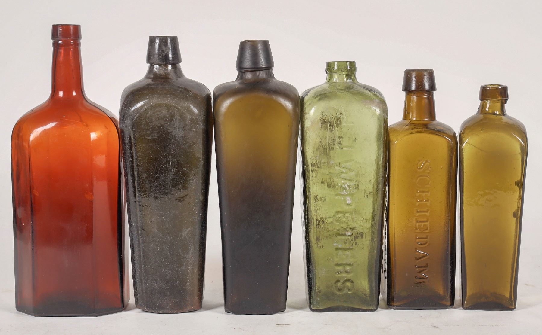 6 gin and schnapps bottles. V Hoytema-case wear especially base, 2x unmarked green gin, JJ Peters-case wear, unmarked amber 8 panel, Aromatic Schnapps-base dings. See photo. No apparent chips or cracks.