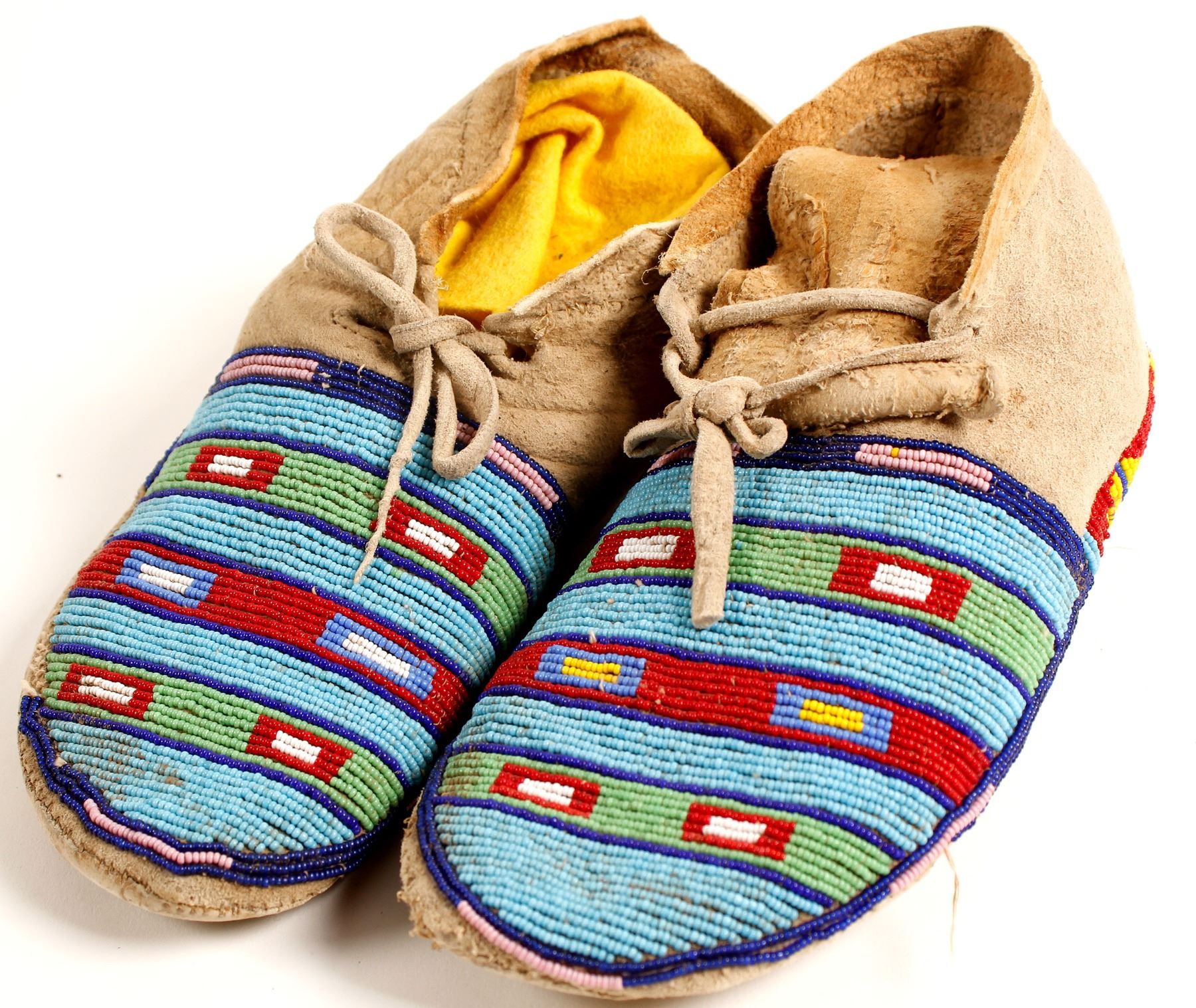 Smoked buckskin Plains moccasins with yellow, blue, red, pink and green beads. Small size. Some heel beads missing on right. Please see the extensive Native American postcard section within lots 4171-4291.