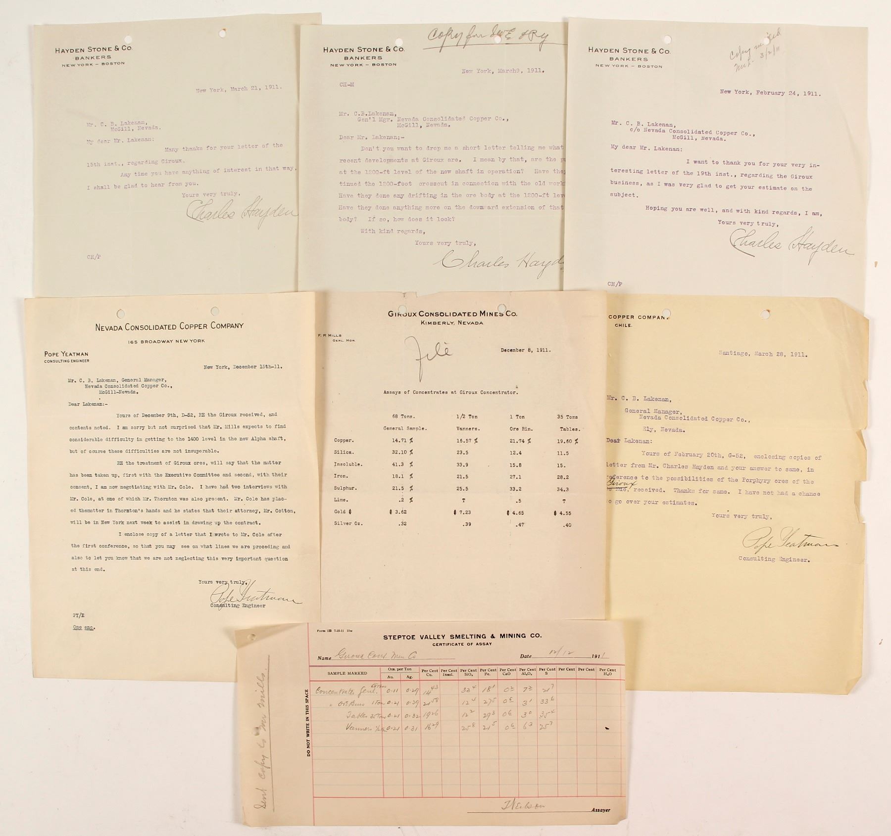 Eight pieces of correspondence, 1911, concerning the Giroux mine and its ores, between consulting engineers and bankers and mine managers.