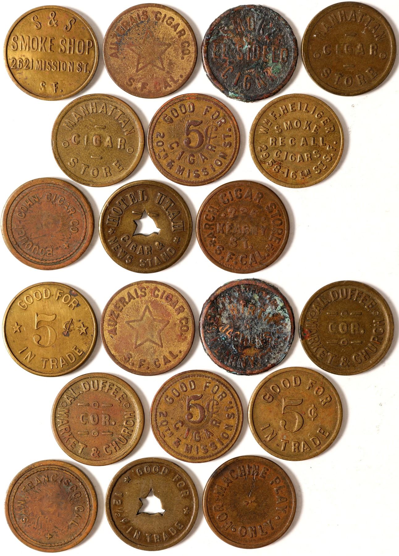Ten tokens from San Francisco Cigar stores. Arch Cigar Store, Manhattan Cigar Store, Hotel Utah, W F Heiliger, Auzerais, Keller & Bray, S & S Smoke Shop.