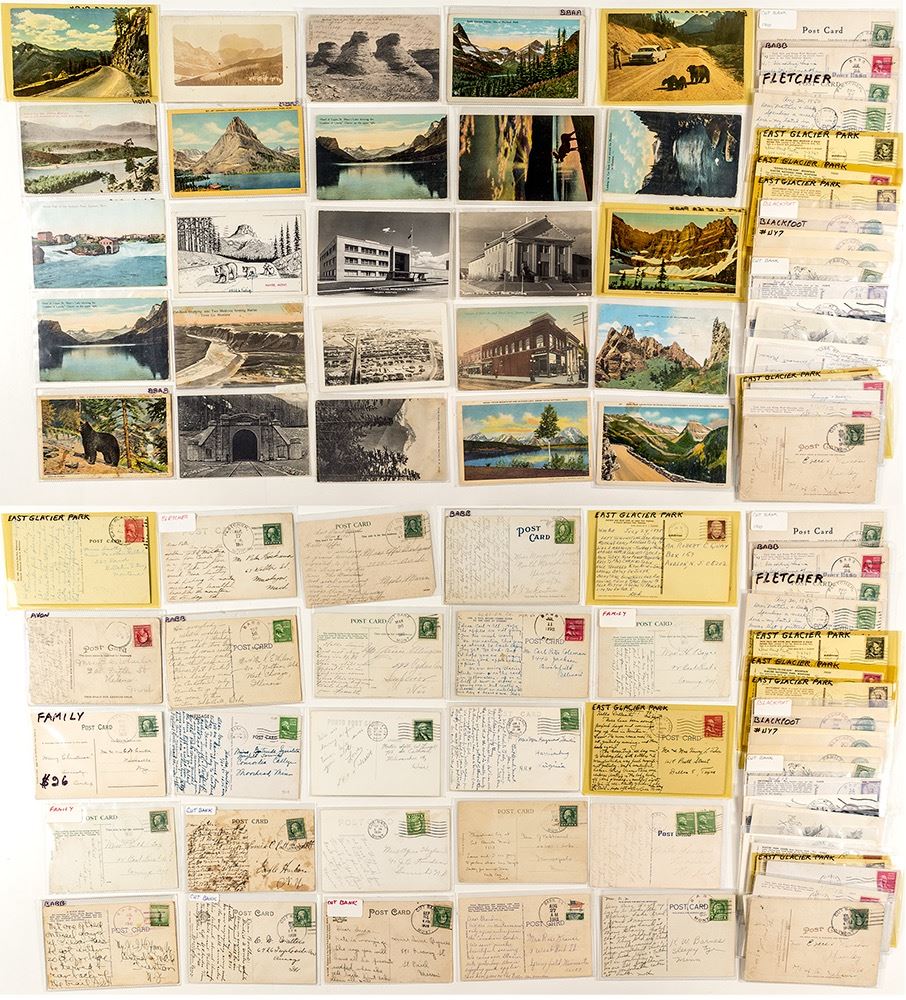 49 total postcards from six different towns: Cut Bank, Fletcher, Family, Babb, Blackfoot & East Glacier Park. Includes two postcards from a post office only open for a short period; Flectcher open from 1913-1915 one of which is also a real photo postcard of a scenic mountain view. Contains three more real photo postcards; two shots of buildings and another town birds eye view. Has seven postal cards. At least four different postmark cancels throughout. (Svoboda Collection) City: Glacier County State: Montana Date: c1908-1975 HWAC# 35537