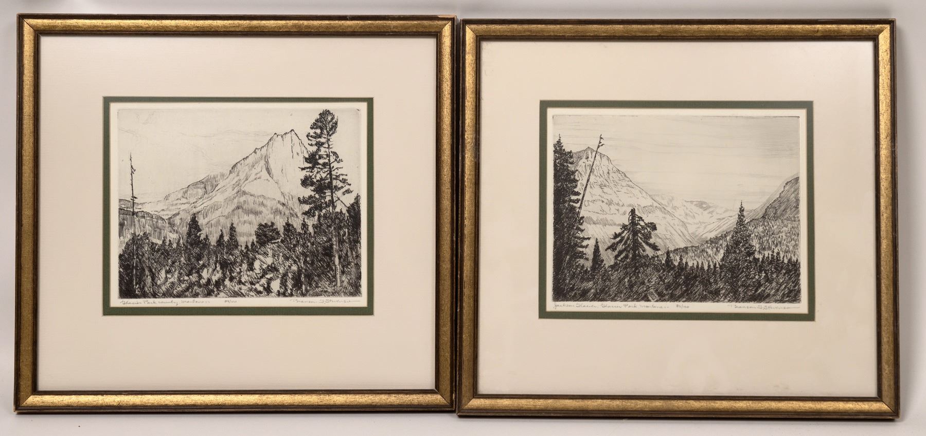 Two different prints of artwork by the Montana artist, Branson G. Stevenson (1901-1989). The first one is titled, "Glacier Park Country, Montana" and is number 89 of 100. The other one is titled, "Jackson Glacier, Glacier Park, Montana" and is number 82 of 100. Both prints are signed by the artist in the lower right corner. Both are nicely matted and framed as well. Overall size of each is approx. 15 x 13.75 inches.