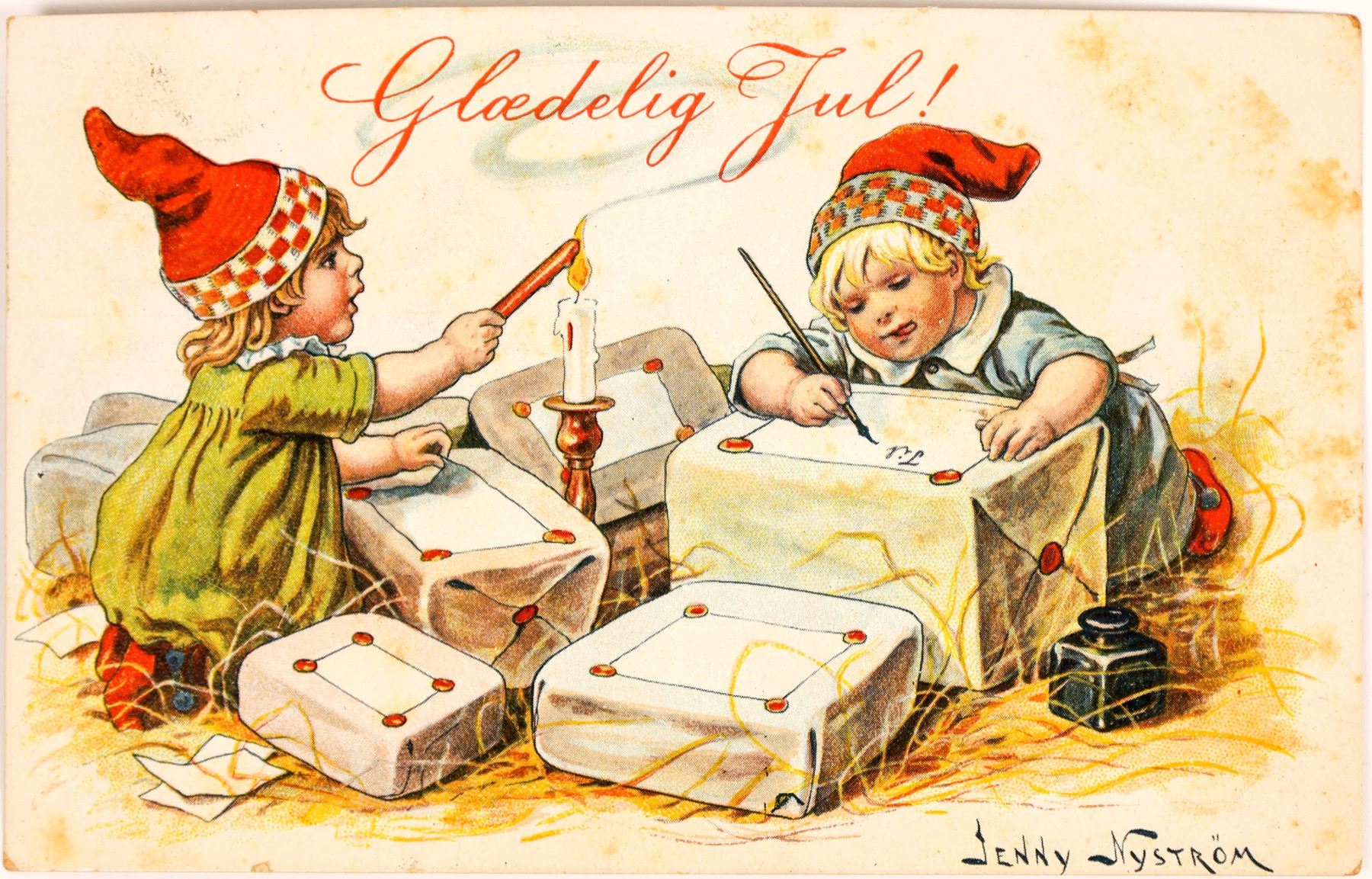 Merry Christmas in Danish. Nice art card by Jenny Nystrom. Jenny Eugenia Nyström (1854- 1946)was a Swedish painter and illustrator who is mainly known as the person who created the Swedish image of the jultomte on numerous Christmas cards and magazine covers, thus linking the Swedish version of Santa Claus to the gnomes of Scandinavian folklore (wiki). Depicts two children maybe making out their Christmas lists. Colorful card in good condition.