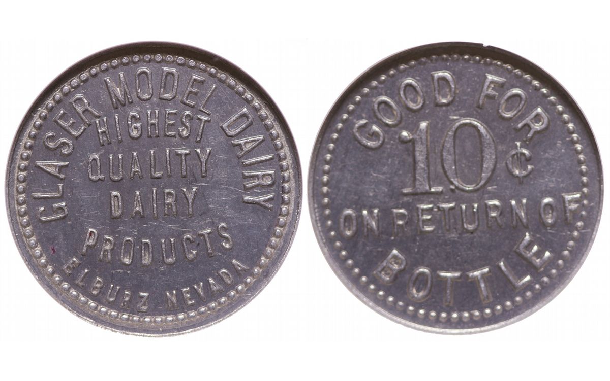Obv.: Glaser Model Dairy / Highest / Quality / Dairy / Products/ Elburz, Nevada; rev.: Good for / 10c /on return of / bottle. Al, 25mm, NCG MS63.