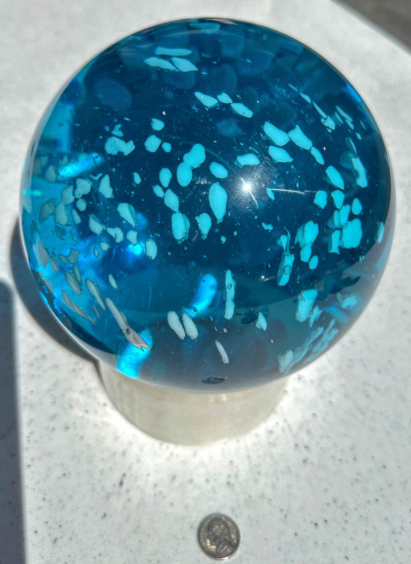 Artisan glass sphere, 7-inch diameter, made of transparent blue glass with inclusions of white glass. China Chunlin Zhu Collection
