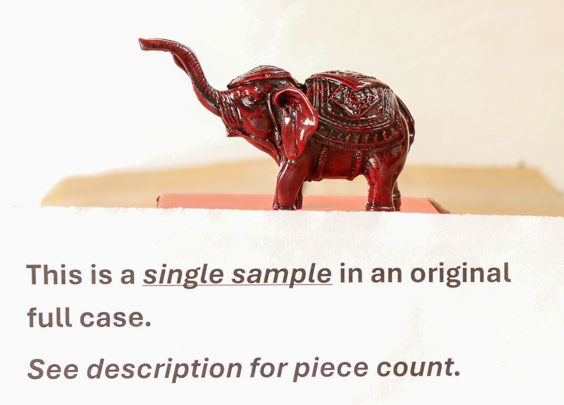 100 small 2.75x2.5x1.5" clear glass elephants in original boxes. These items have been in storage for 20 years and have not been inspected. Sold as is.