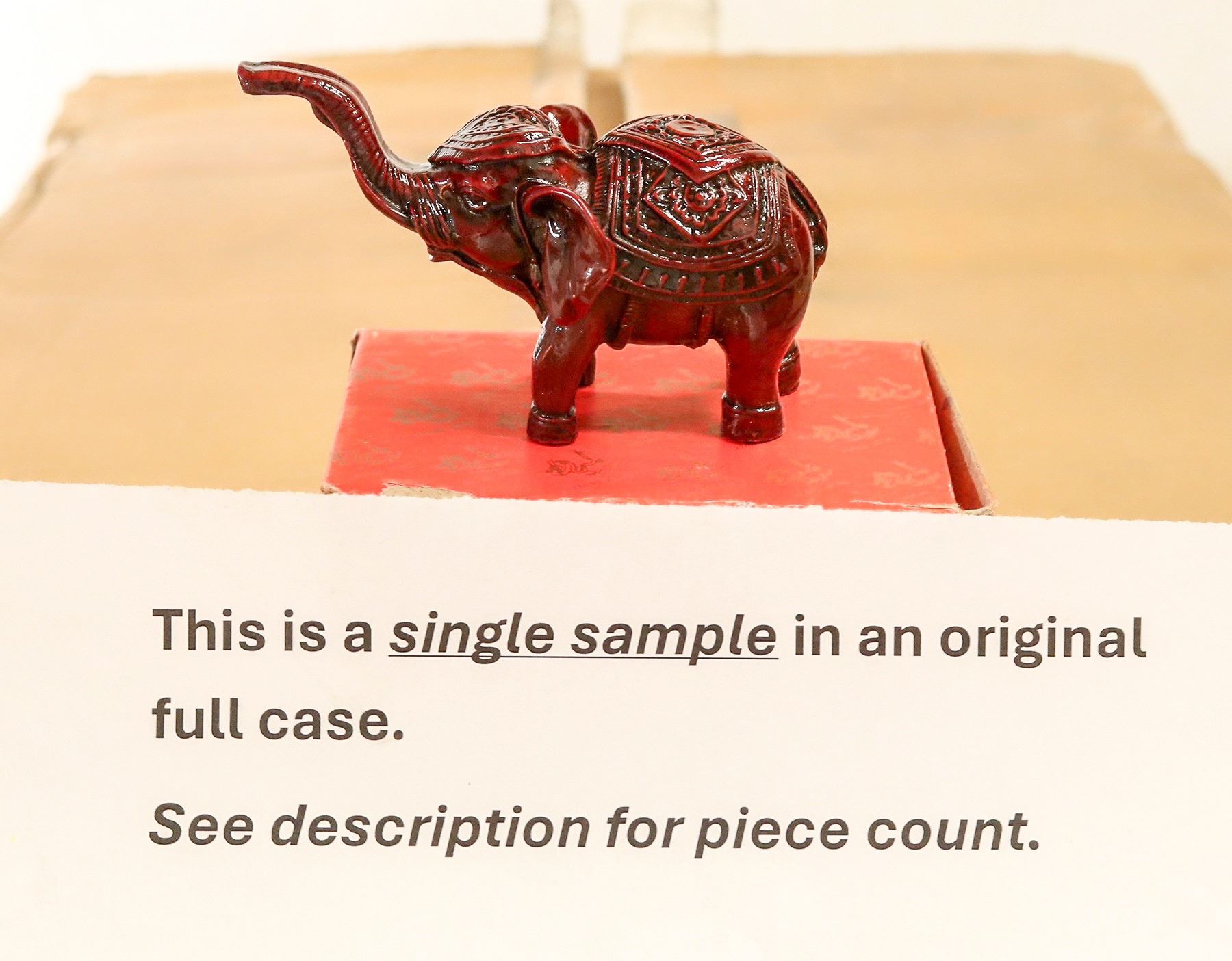 100 small 2.75x2.5x1.5" clear glass elephants in original boxes. These items have been in storage for 20 years and have not been inspected. Sold as is.