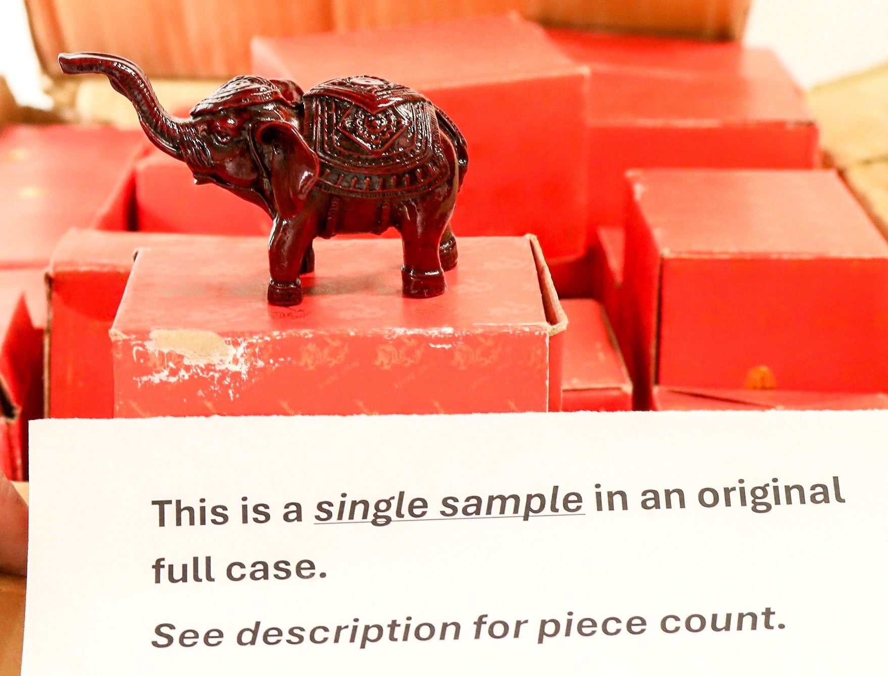 100 small 2.75x2.5x1.5" clear glass elephants in original boxes. These items have been in storage for 20 years and have not been inspected. Sold as is.