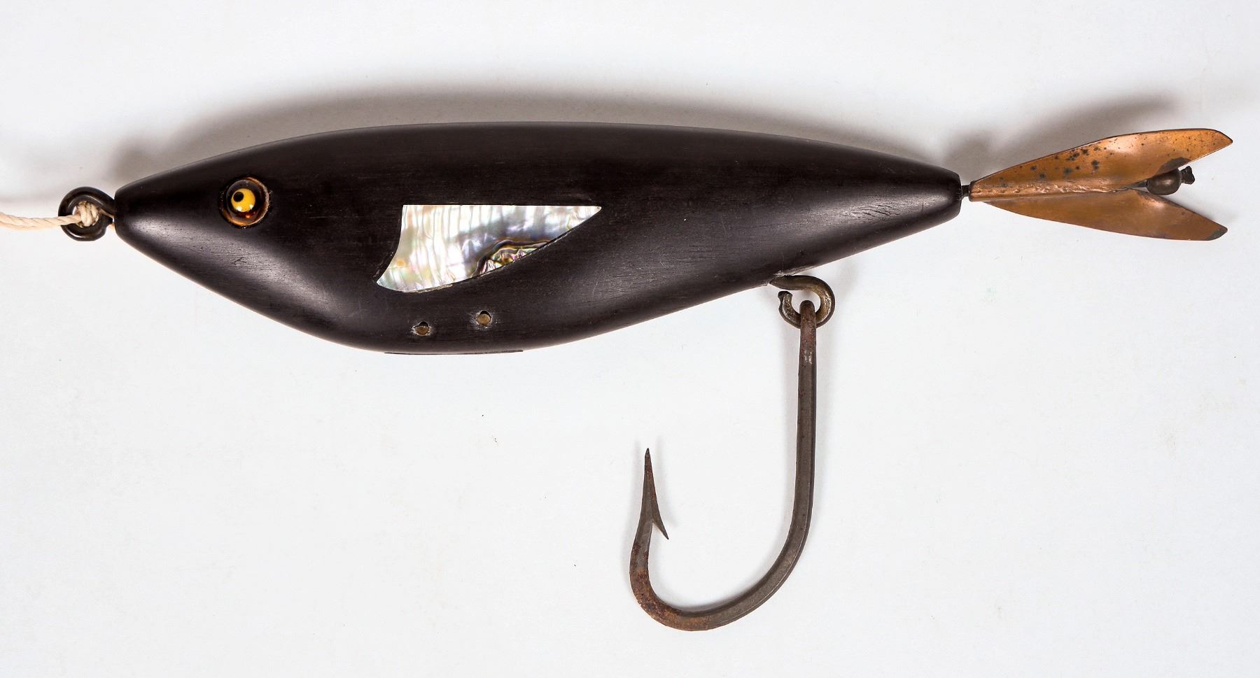 Glass Eyed Ebony & Abalone Big Game Ocean Lure, handmade by a fisherman. common Pacific Coast Beaches. 1020-30's. In overall very good cond.