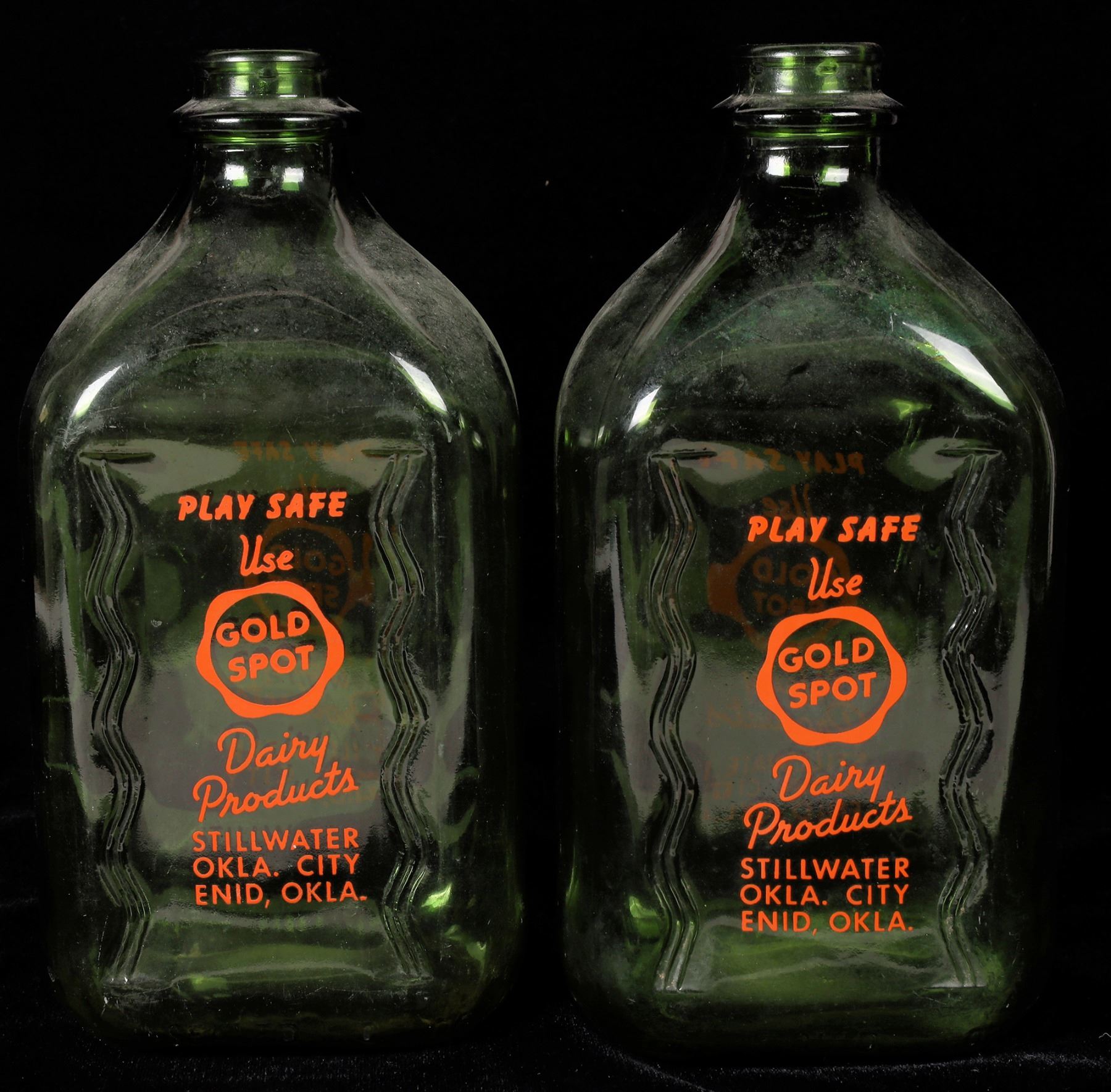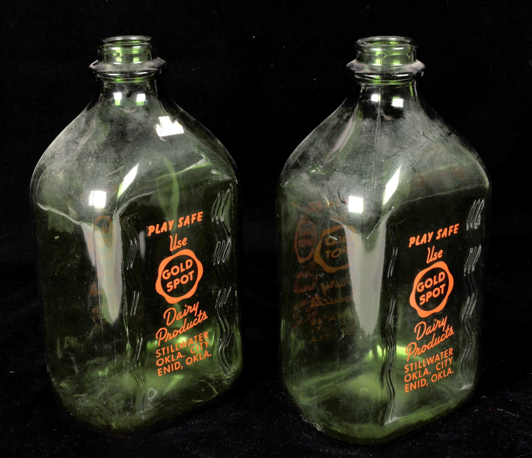 Two one half gallon green tinted milk bottles from Gold Spot Dairy Products of Enid, Oklahoma City and Stillwater. The company was established in 1930 and seized operation in 1963. These were generally delivered to homes. These are green tinted and in very nice condition. Please see photos for more details. Oklahoma Stillwater 1960s