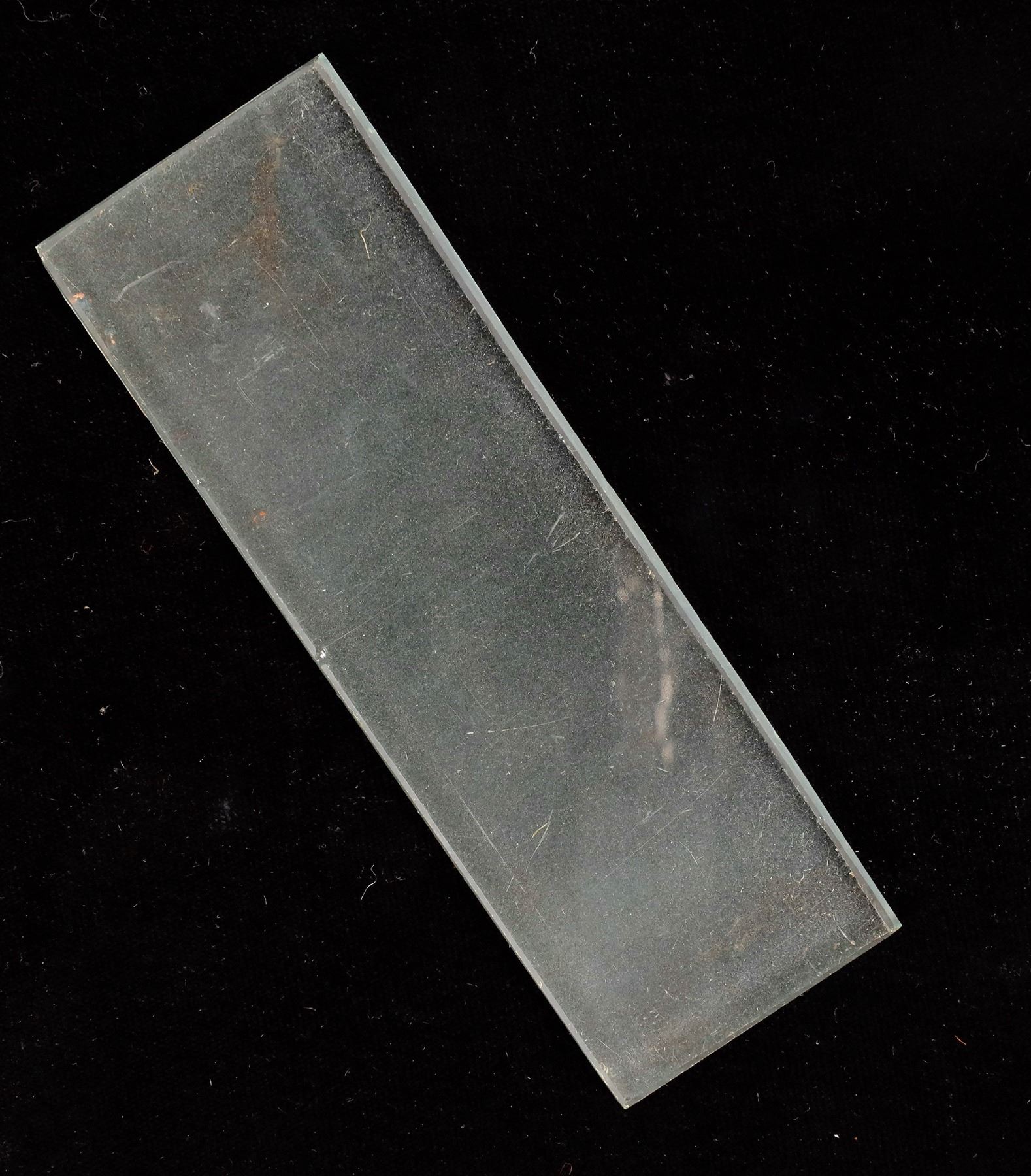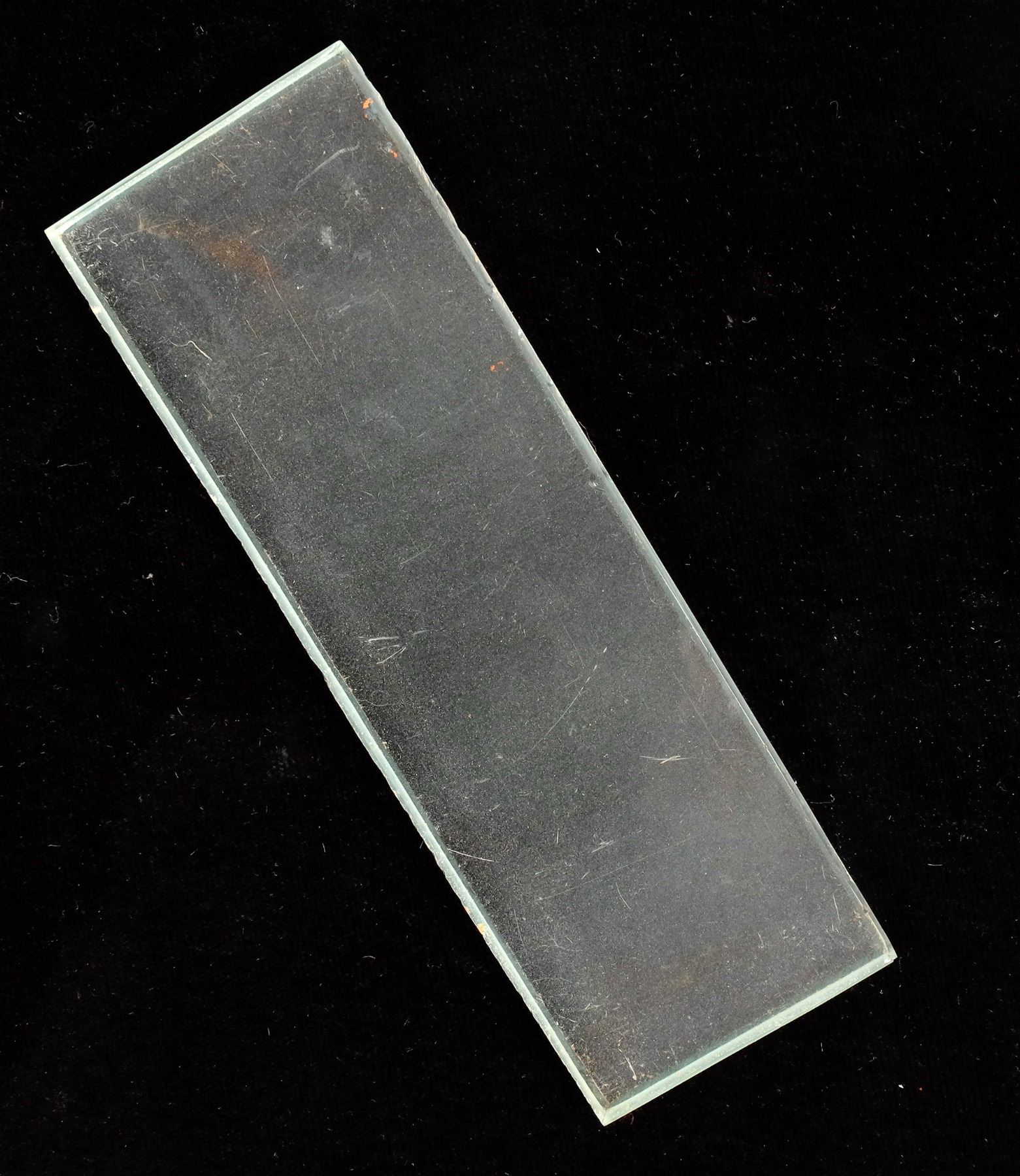 Intact rectangular glass pane with slightly beveled edges. Unknown purpose. 5 3/8x1.75x3/16". Just a few light dings and 1 corner chip on edges. No apparent cracks.