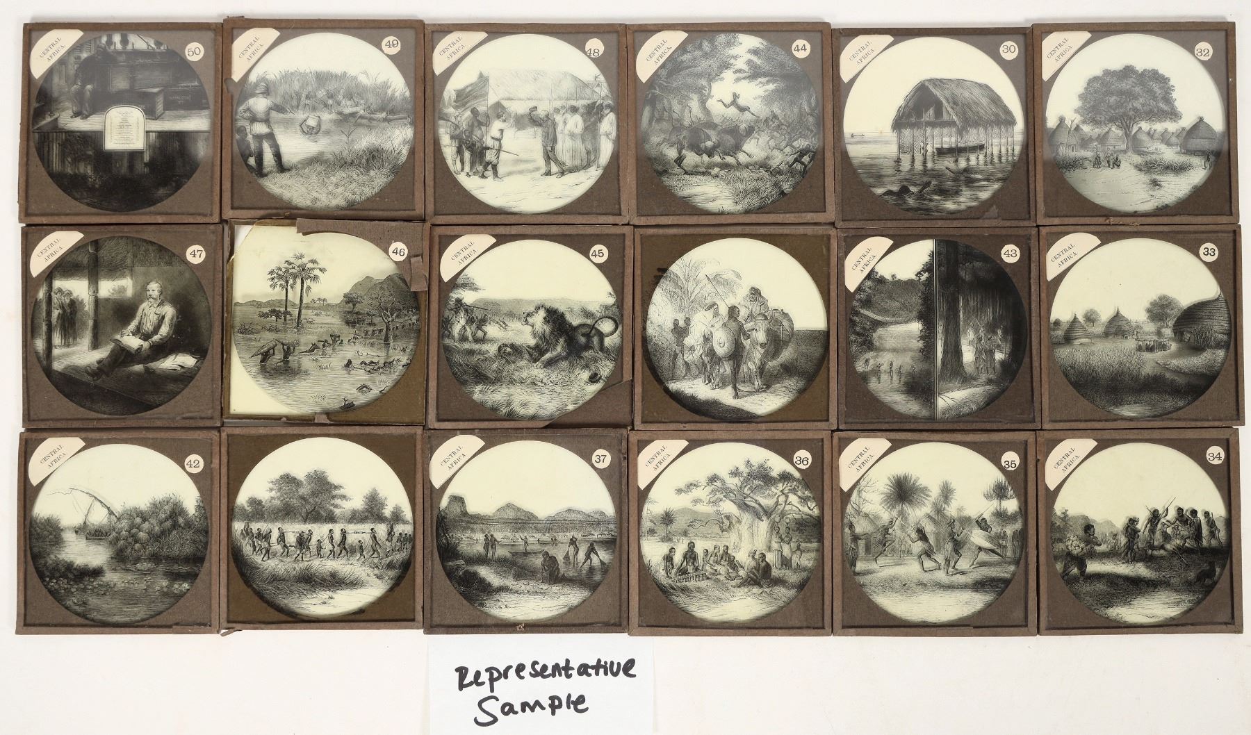 Lot of 50. In wooden case. These large lantern slides of life in Central Africa 1895- 1910 c. These are drawings of the life depicted. Appear in goof condition, each slide was not checked.
