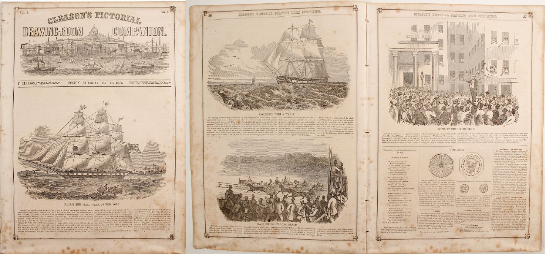 An item previously never seen by us. Page 37 has an announcement of a new California $50 gold piece and 3 cent coin for post office use. 16x11". Foxing throughout. Mackie Collection