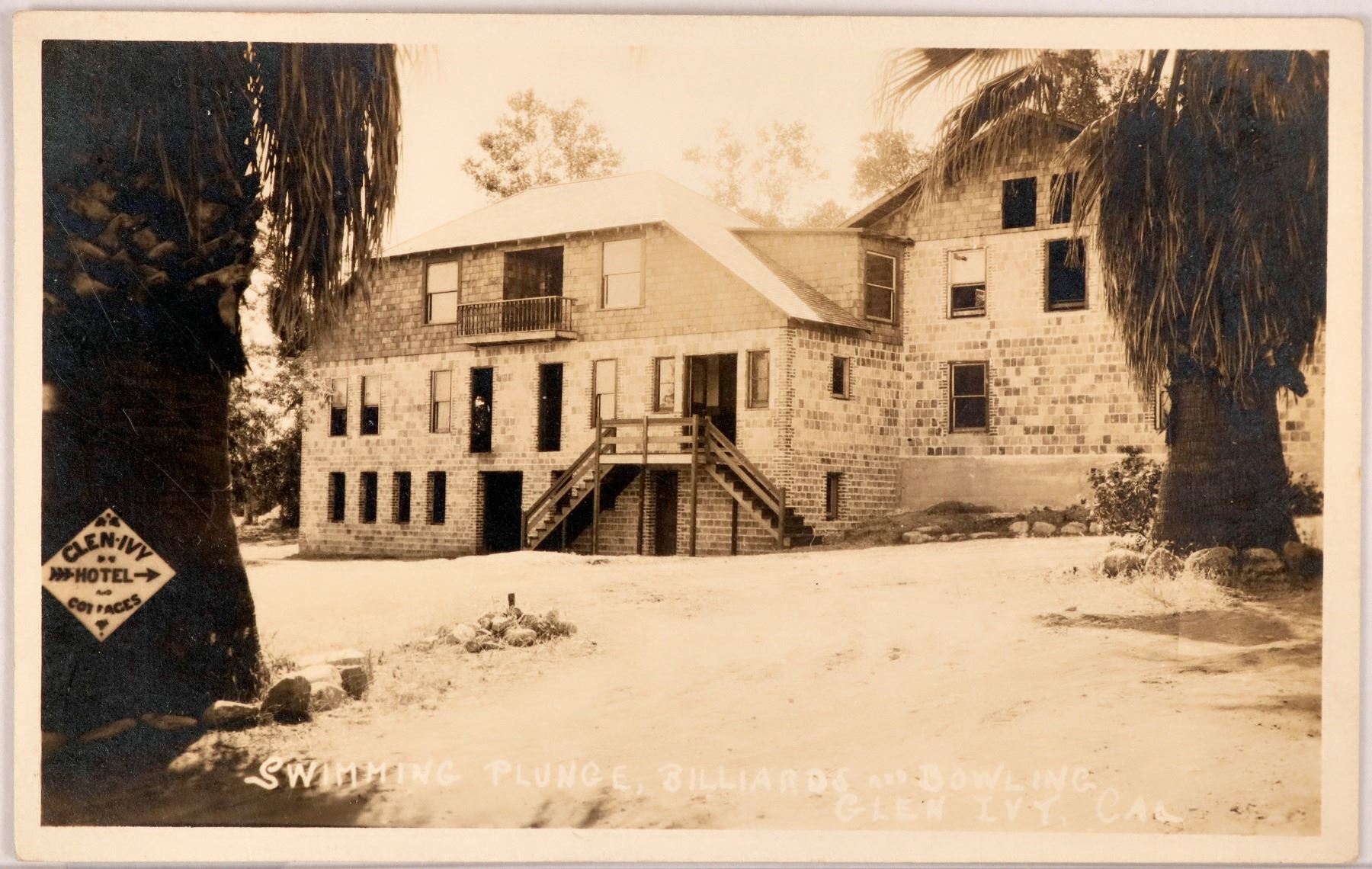 Building view of palm trees, and the Glen Ivy Hotel and Cottages/ "Swimming Plunge, Billiards and Bowling,; correspondence dated March 17, 1924, cancellation Albe 1924;/