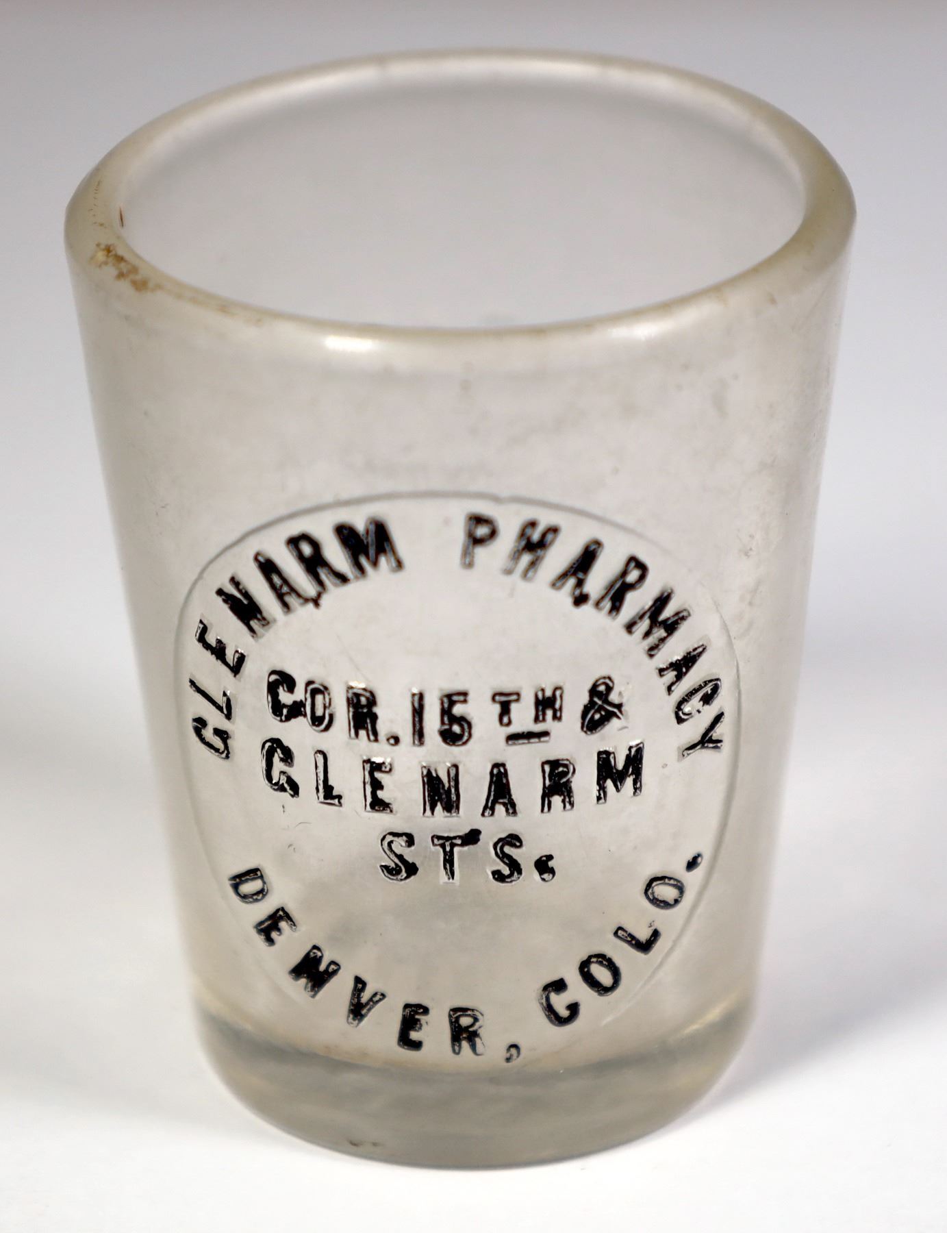 Glenarm Pharmacy / Cor. 15th & / Glenarm / Sts. /Denver, Colo. Embossed dose glass with black lettering. Reverse has marks for Tea, Dessert, and Table measurements. WT & Co., AK, USA. 1 7/8" Small area of roughness on lip, soiling. Business dates back to the 1890s.
