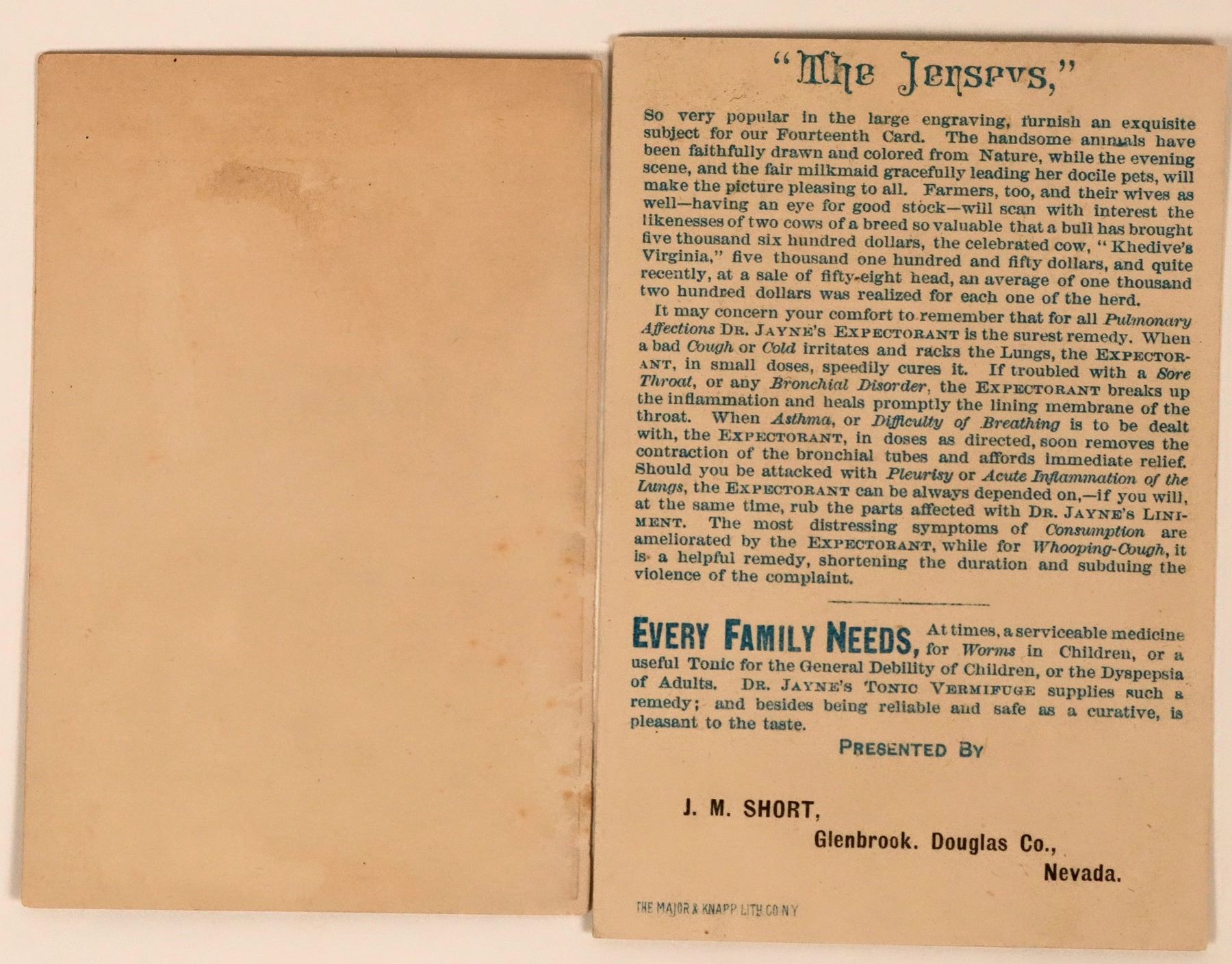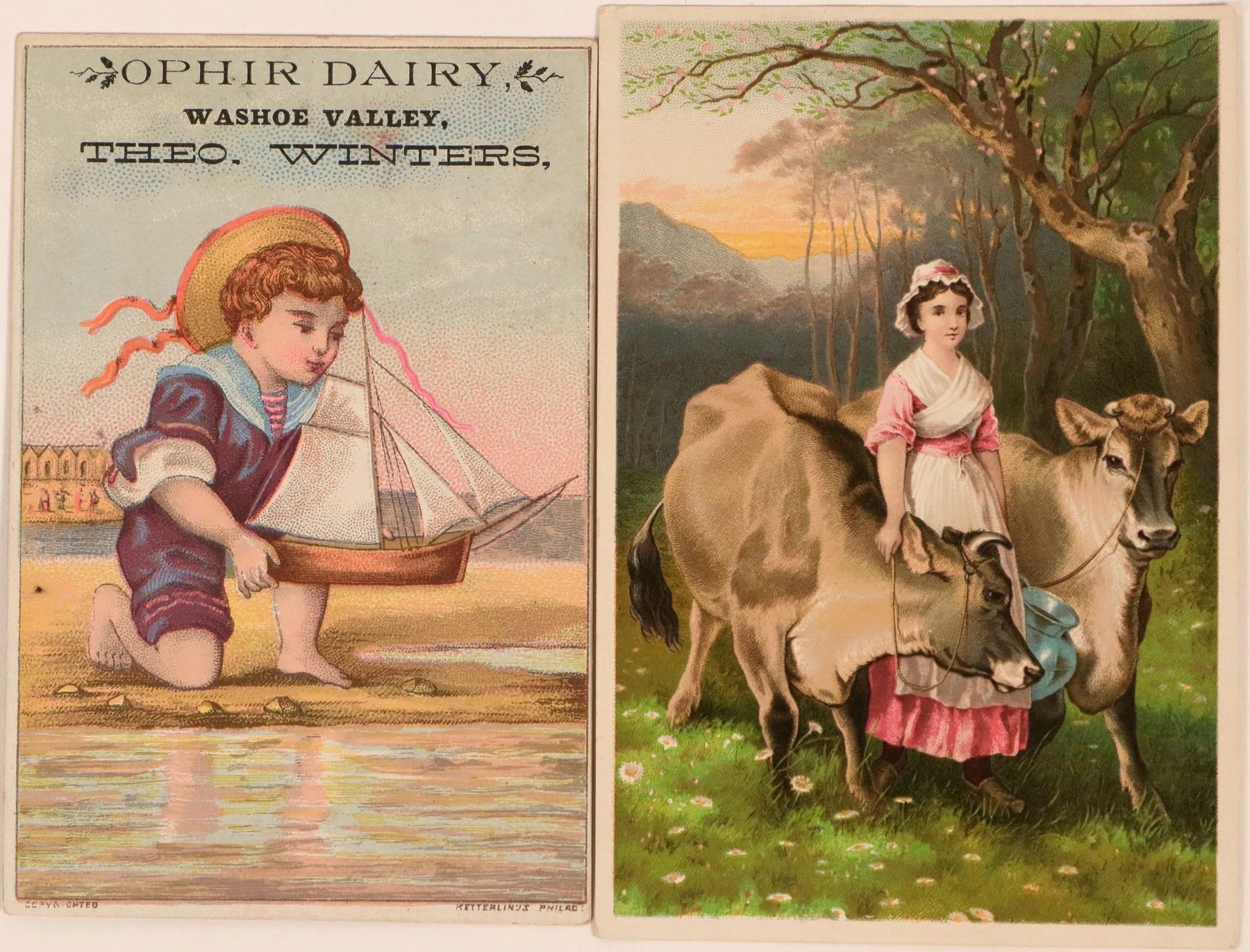 Lot of 2. 1) Ophir Dairy, Washoe Valley, Theo. Winters. Prominent Nevada and California rancher and land owner. 2) JM Short, Glenbrook, Douglas Co., Nevada, printed on ad for Dr. Jayne's Expectorant. (Fred Holabird Nevada Trade Card Collection)