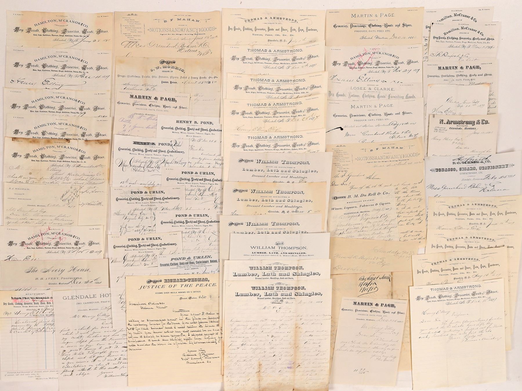 About 45 pieces of Glendale, MT letterheads from merchants of clothing, hats, feed, lumber etc. Also hotel letterheads. c. 1878-82.