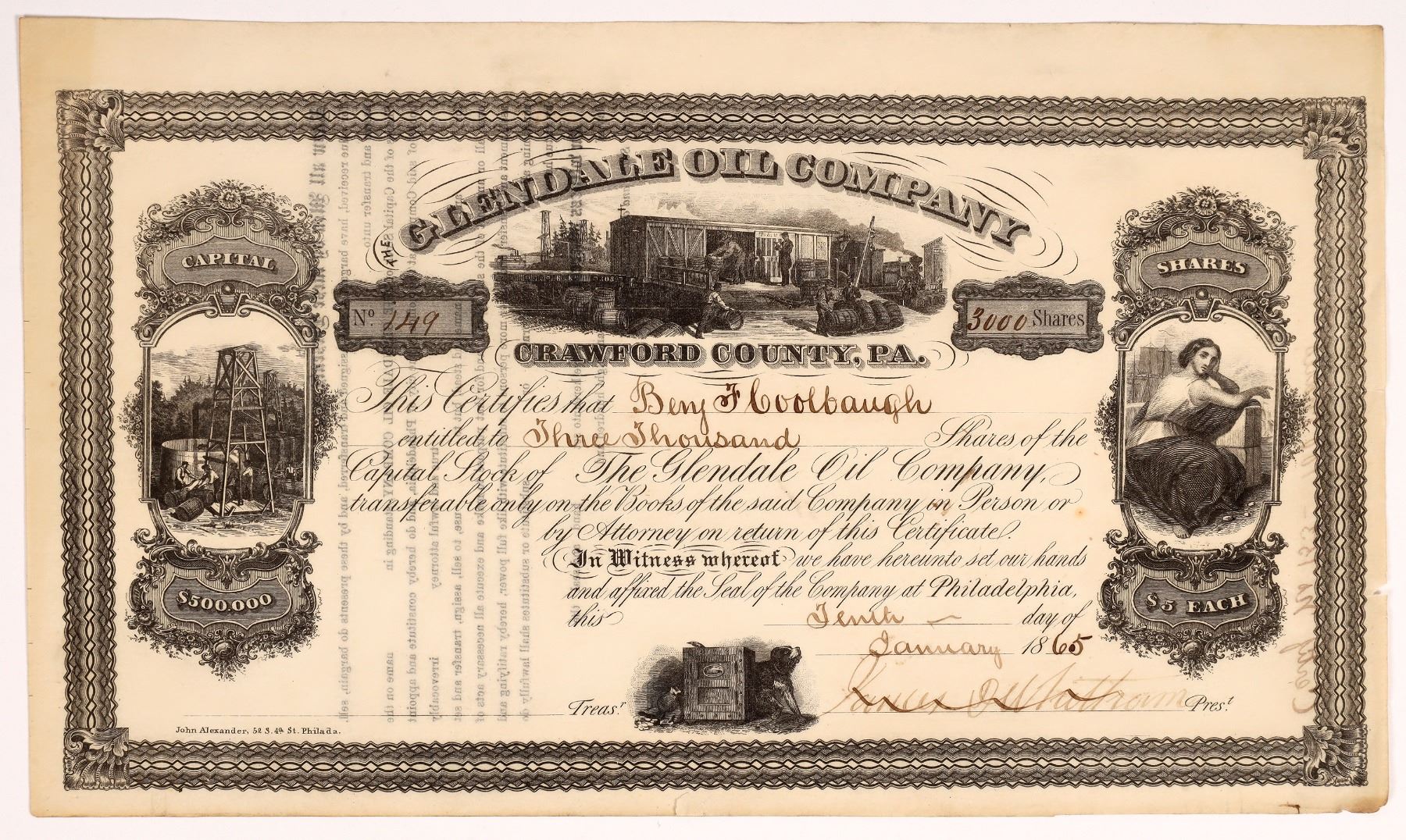 "Crawford County, PA." printed under vignette. No. 149, issued for 3,000 shares to Benj. Coolbaugh in 1865 in Philadelphia. Signed by the president (illegible). Pen cancelled. One allegorical vignette (right); vignette of oil drums being loaded onto train car (top center) and oil derrick (left border). 6.5 x 11" Printed by John Alexander, Philadelphia. Some wear to edges.