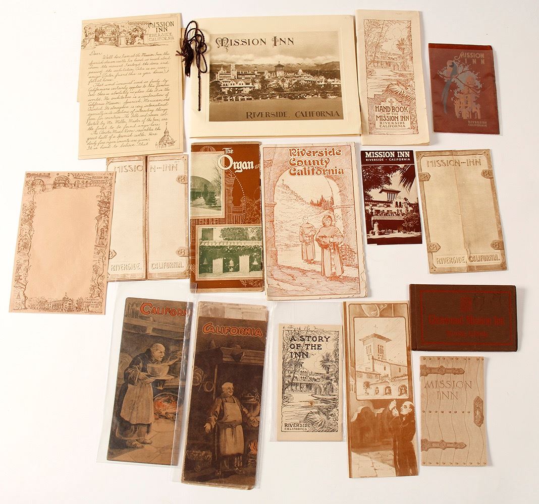 Lot of 17. Includes: c.1916 brochure "A Story of the Organ and The Bells," published by the Salt Lake Route with discussion of Mission Inn; c.1944 booklet "Handbook of the Mission Inn," 75 pages, 9 x 4"; undated mint photo book, Mission Inn, by The Albertype Company, 12 full page printed photographs, 8.25" x 10"; book of 10 unused postcards, published by Julius J. Hecht, not dated; 1926 & 1932 menus for the Mission Inn; unused letterhead; promotional pamphlet made to look like a handwritten letter, undated; c.1914 Riverside County Promotional Booklet, illustrated, 9.25" x 5.5"; and other promotional booklets and brochures for the inn. Please inspect. (Prag Collection) Date: Location: Riverside, California HWAC# 55420