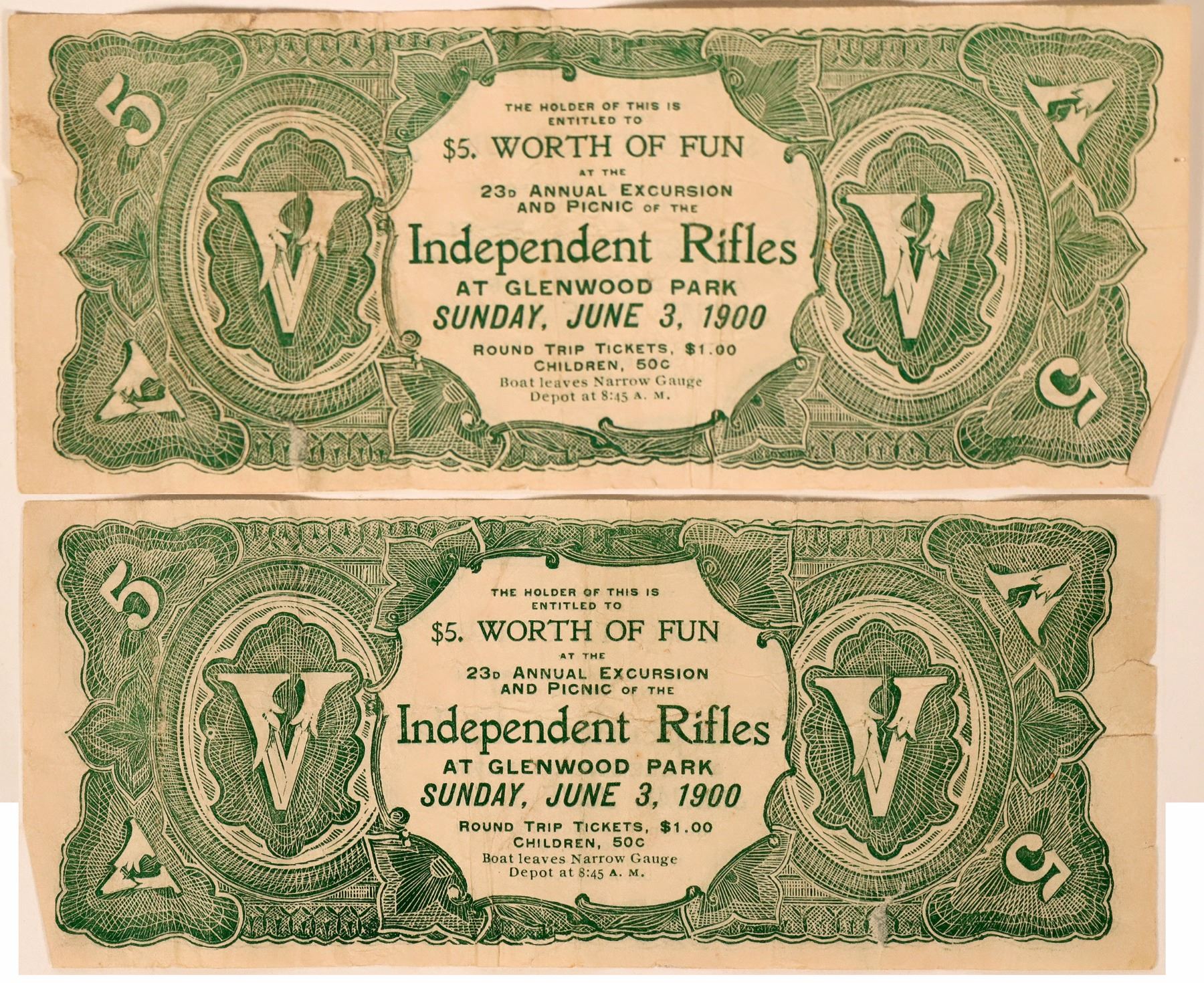 Nice $5 scrip note for the Glenwood Park at Batavia, Ill. Dated June 3, 1900. "23rd annual excursion and Picnic of the Independent Rifles. VG. We assume this is the park at Batavia, which seems to be the only one open in America at that time with this name.