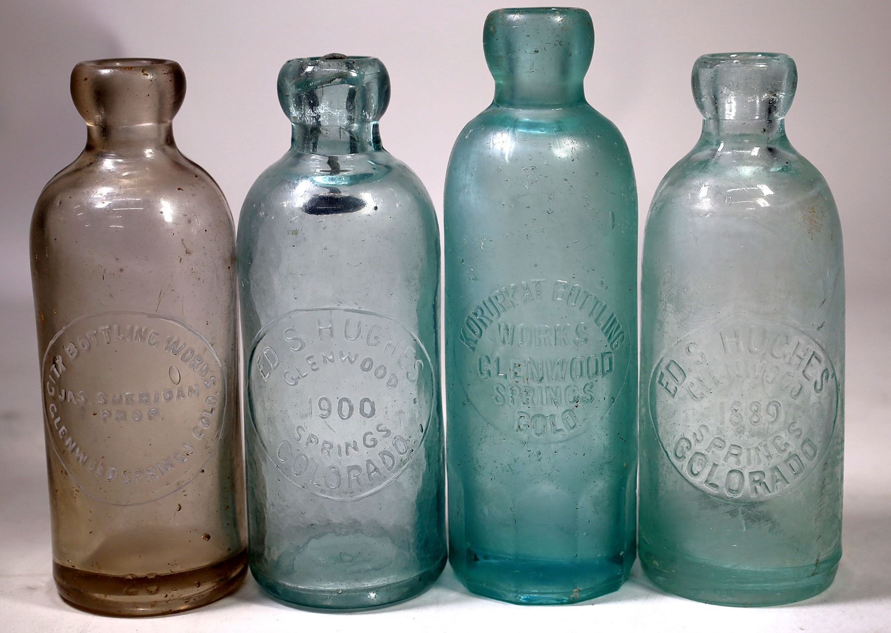 4.) CITY BOTTLING WORKS/JAS.SHERIDAN/PROP./GLENWOOD SPRINGS COLO. Clear & measures 6 1/2 inches tall. Unmarked base, s180, which Preble dates c.1902-08. Hazy Interior that may come clean. Nicks around the body of bottle & scratch marks; may polish also. Staining at lip and shoulders, as well as at and around base.