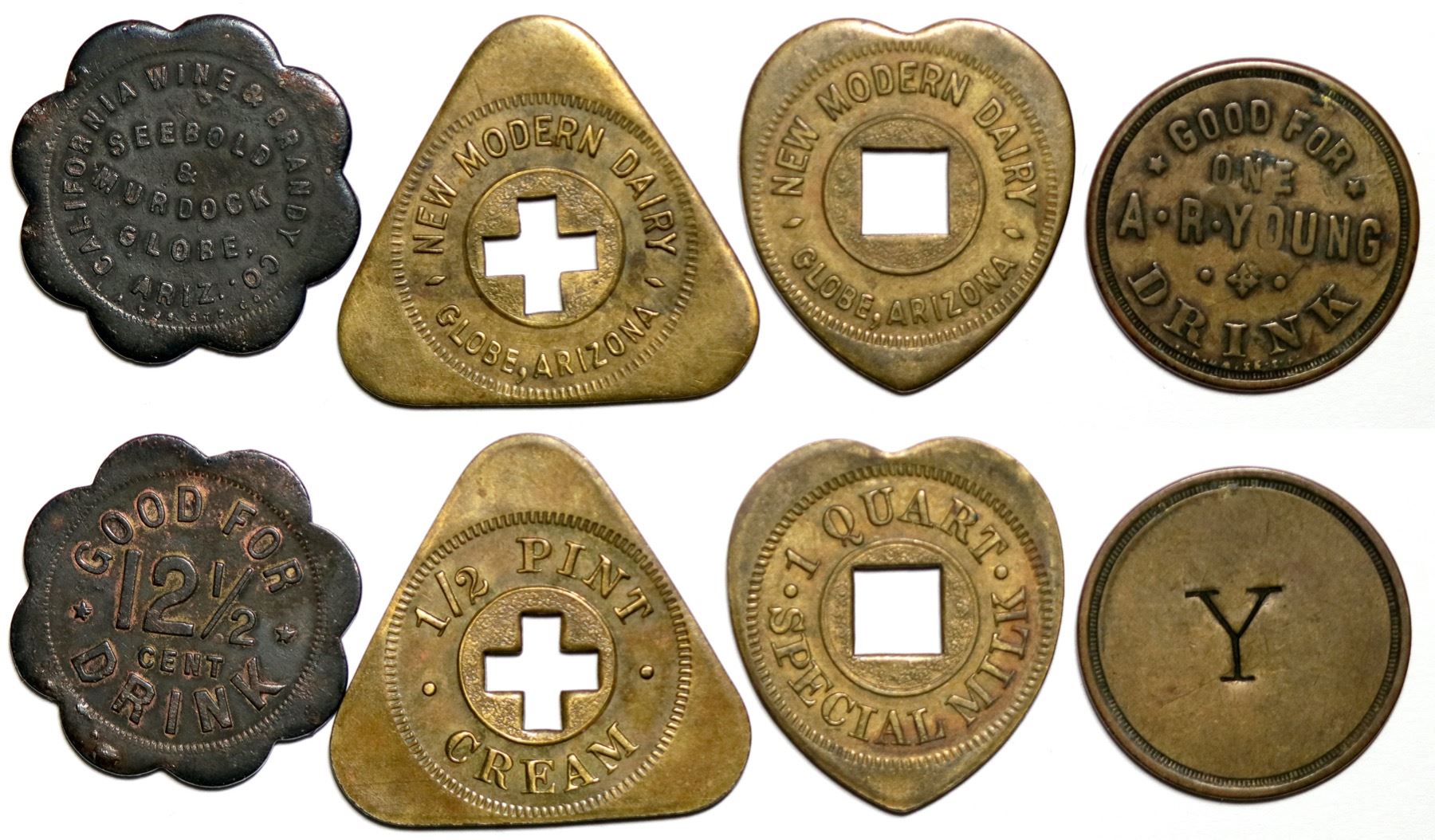 Lot of 4. 1. California Wine & Brandy Co./Seebold/& /Murdock/Globe/Ariz./Lakes STP Co.//G.F./12 1/2/CENT/Drink. 8 Scal., Br., 21mm. 2.G.F./One/A•R•Young/••/Drink.// Y. Rd., Br., 24mm. 3. New Modern Diary/Square Hole cutout /Globe, Arizona.//•1 Quart•/Special Milk. Heart Shaped. Br., 27mm. 4. New Modern Diary/ Cross cutout center/Globe, Arizona//1/2 Pint/Cream. Triangle, Br., 29 mm.