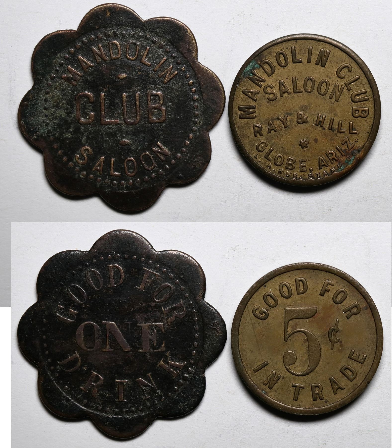Lot of 2. 1. Mandolin/Club/Saloon//G.F./ One/Drink. 8 scalp., Br., 29mm. 2. Mandolin Club/Saloon/ Ray & Hill/Globe, Ariz.//G.F./ 5¢/ In Trade. Rd., Br., 21mm.