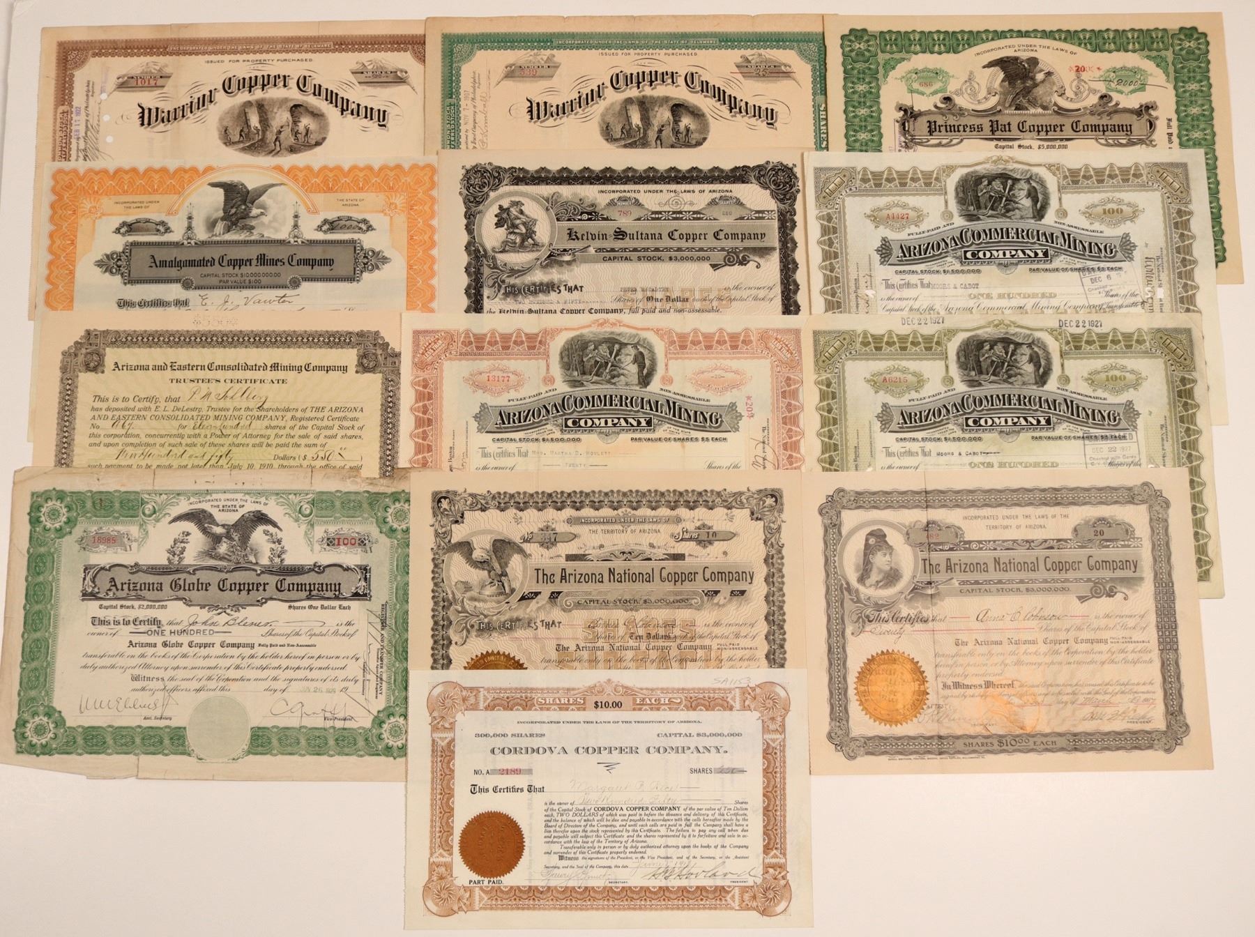 Lot of 13 different. Included: Princess Pat Copper Company (1917); Amalgamated Copper Mines Company (1917); Kelvin-Sultana Copper Company (1910); Cordova Copper Company (1918); Arizona & Eastern Consolidated Mining Company (1909); Arizona Commercial Mining Company (three different, 1915, 1916, 1918); Arizona Globe Copper Company (1929); Arizona National Copper Company (two different, 1907); and Warrior Copper Company (two different, 1907, 1922). Fair condition. Please inspect.