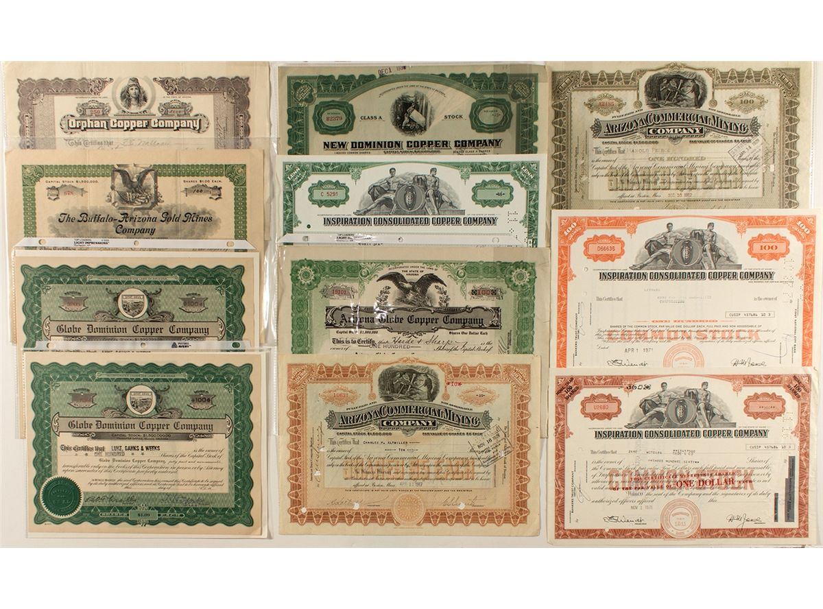 A group of 10 certificates from Globe, Arizona operators. 1)Orphan Copper Co., issued 1908 for 100 shares. Inc. in Arizona. Operated at Globe (1908 C.H.). Unc. 2)The Buffalo-Arizona Gold Mines Company, issued 1908 for 100 shares. Inc. in Az. Issued at Providence, R.I. Operated at Globe Hills (Garbani) Unc. 3-4)Globe Dominion Copper Company, one issued in 1918, other one issued but not dated. Transfer office, Globe, Arizona printed on the masthead. Both Unc. 5)Arizona Commercial Mining Company, issued 1917 for 10 shares. Operated at Globe (Garbani). Stamp cxled. 6)Arizona Commercial Mining Company, issued 1912 for 100 shares. Stamp cxled. 7)New Dominion Copper Company, issued 1930 for 25 shares. Operated at Globe Hills (Garbani). Hole cxls. 8)Arizona Globe Copper Company, issued 1929 for 100 shares. Uncancelled. 9-10)Inspiration Cons. Copper Co. issued 1963, 1971. Orange and green variety. The company dates back to 1911. In 1920, the company helped organize the Apache Powder Co. Both are hole punch cxled. A nice collection of stocks from Globe.City: GlobeCounty: GilaState: AZDate: