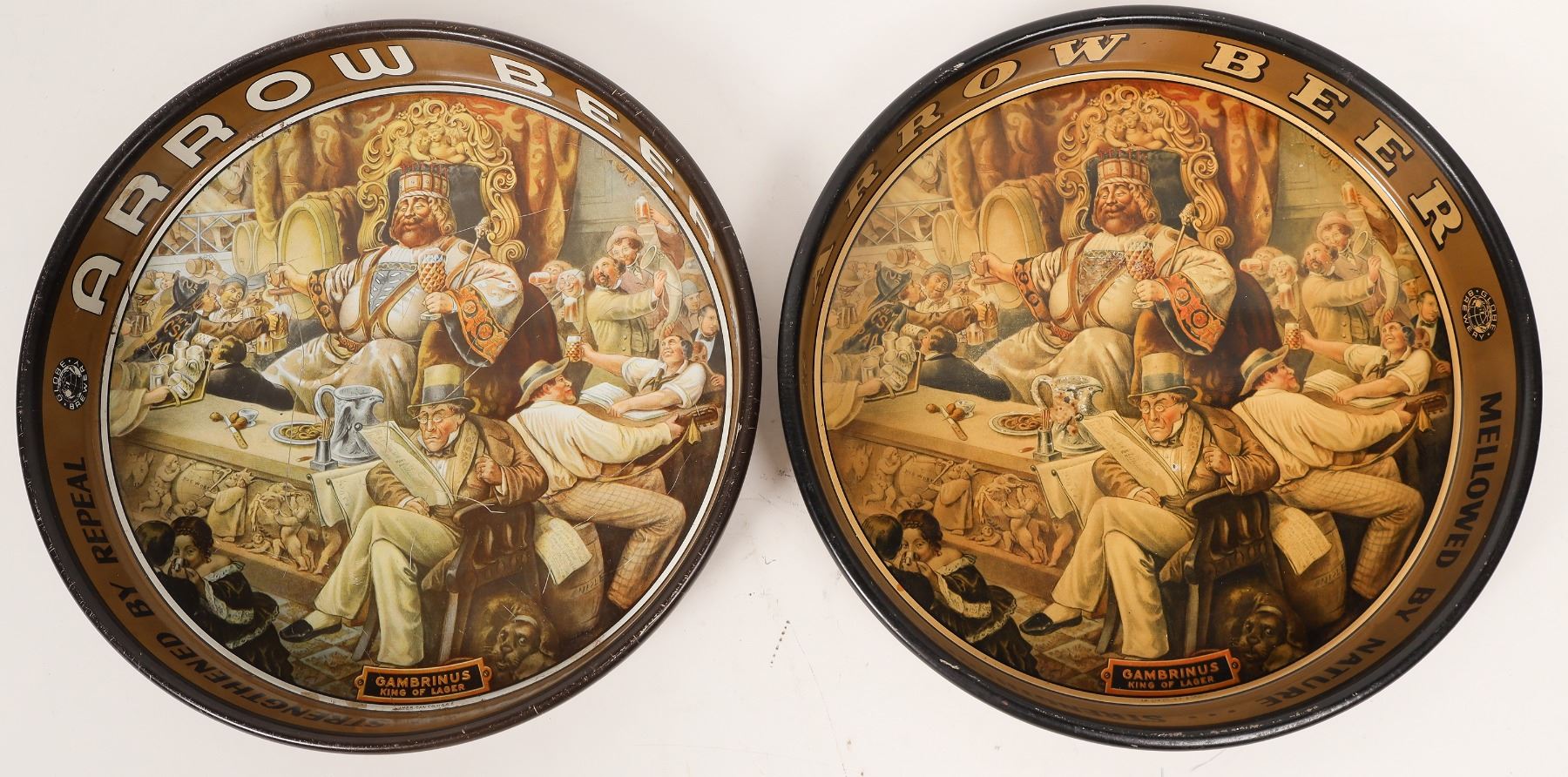 This is lot of 2 beer trays at about 13 in. from Globe Brewery for their Arrow Beer. The scene depict s" Gambrinus the King of Lager". Globe Brewery was located in Baltimore, Md. One tray is in very good condition the other is in excellent condition with a very light scuff. C. 1933-1963. Baltimore Maryland c. 1933-1963