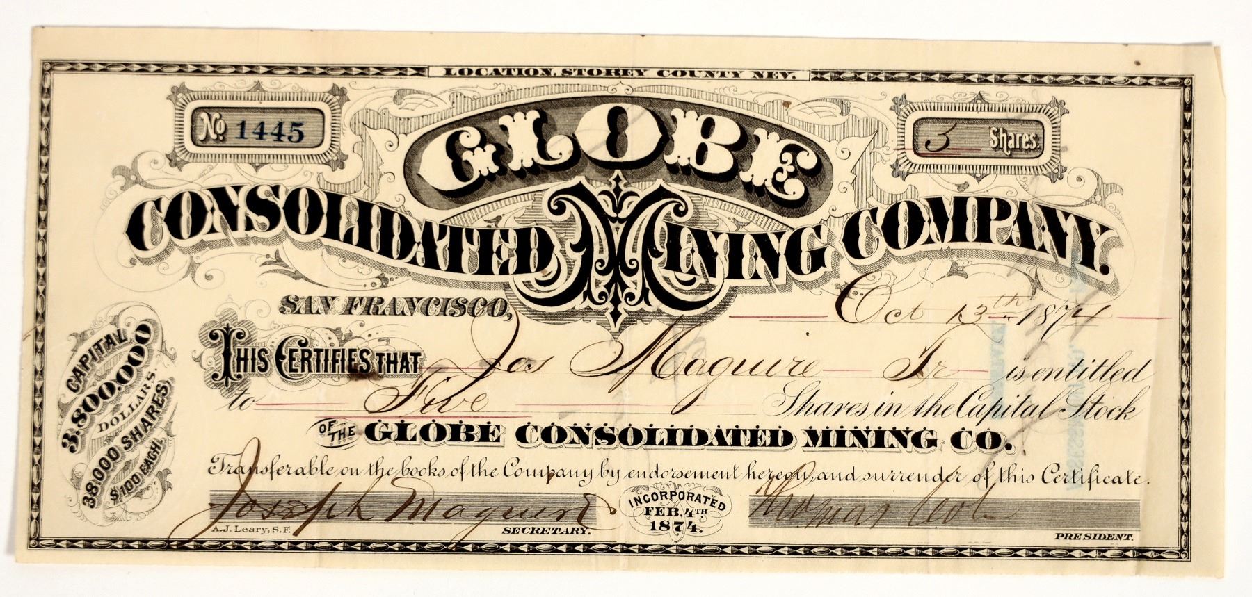 Very rare. "Location. Storey County Nev." printed at top center. Inc. February 1874. No. 1445, issued for 5 shares to company secretary Joseph Maguire in SF in Oct. 1874. Also signed by president Thomas Leob(?). Not cancelled. Black border and print, fancy title. AJ Leary printer. Folds, pinhole. 4 x 9" This company was north of the Baltimore Consolidated and owned the Globe, Arizona, Utah and Jura claims in American Flat (next to Gold Hill). On the 500ft. level, they struck water and it flooded the mine up to within 25 feet of the 300 ft. level. They had found good ore before that happened. (Annual Mining Review & Stock Ledger, 1876, pg. 48).