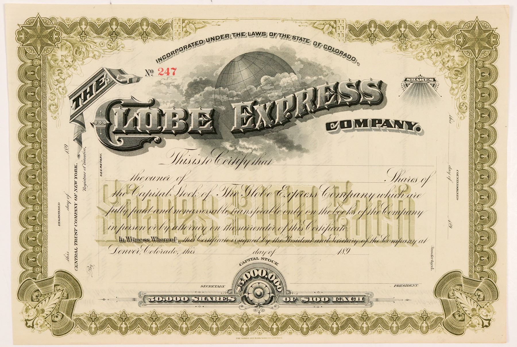 Unissued. Inc. in Colorado. No. 247. Denver, 189- dateline. Green border, black print, and globe in the clouds vignette. Printed by the Homer Lee Bank Note Co., New York. 7.75 x 11" Formed in 1891 in Colorado, this express company was immediately controlled by the Denver & Rio Grande Railroad. Ken Prag Collection
