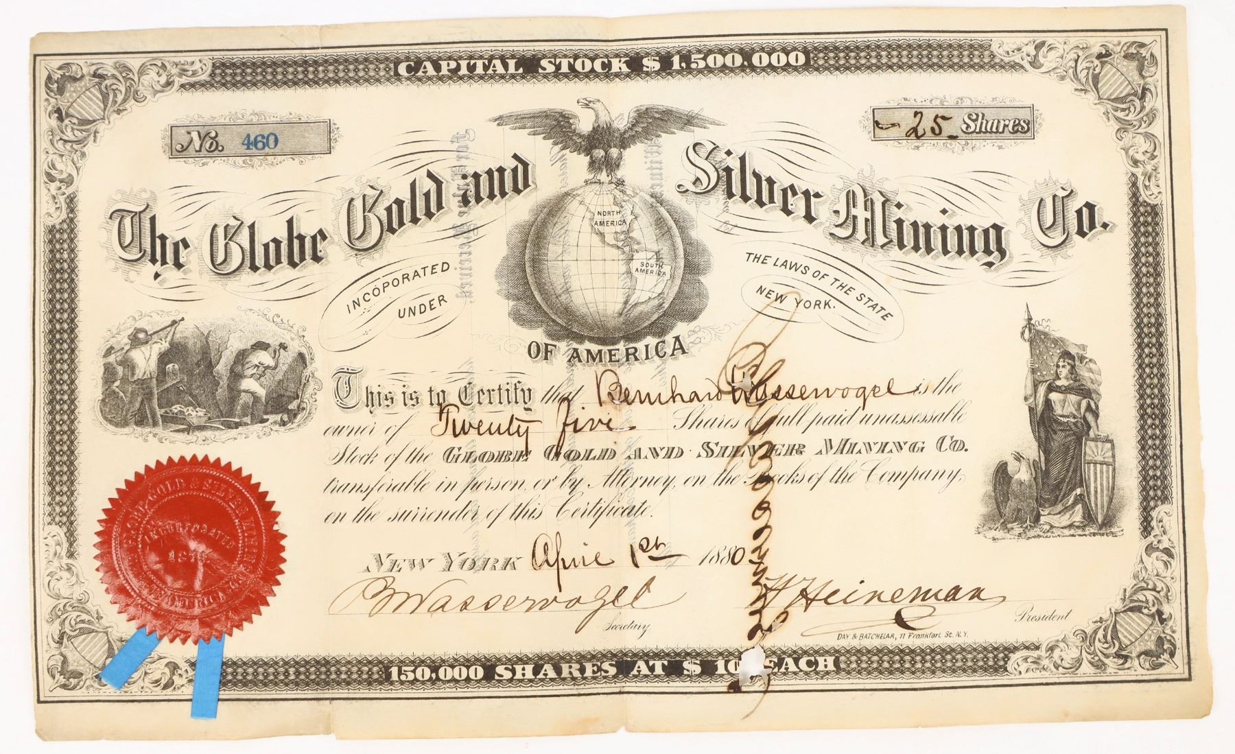 Incredibly rare. # 460 for 25 shares to Bernard Vaservogel. Signed by Vaservogel and president Heineman. Dateline New York 1880. Incorporated in New York in 1879. Eagle, glove, allegorical female, underground mining vignettes. Day & Batchelar printers. Not cancelled. Bright red seal with blue ribbons (quite unique!) Edge issues. Ink eating away paper in a few places. "...proceeding up Monitor Creek toward the town of Monitor (a mining with a present population of about 200), we reach the Globe Gold Silver Mining Company's mine and mill on the right or eastern side the creek. This company, under the superintendence of General Winchester, has done a considerable amount of work, About 300 feet from the mouth of its tunnel was struck gray sulphide of copper - some of which assayed as high as 37 per cent copper and $26 in silver with a trace of gold. On this the company sinking but had got down only 30 or 40 feet when the water proved much to for the machinery. The company is driving the main tunnel to ledge which is on the same belt as the Imperial and which is to be struck in 60 or 70 feet The mill has been run only experimentally."