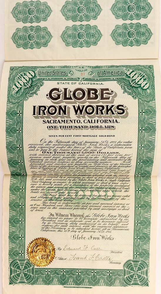 1 gold bond $1,000. First Mortgage at 7%. No. 37, with 10 coupons attached. Signed by President Edward F. Cadle. 9.5" x 14.5". HWAC# 53728 Date: 1915 Location: Sacramento, California